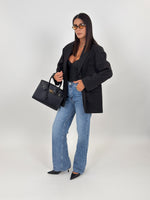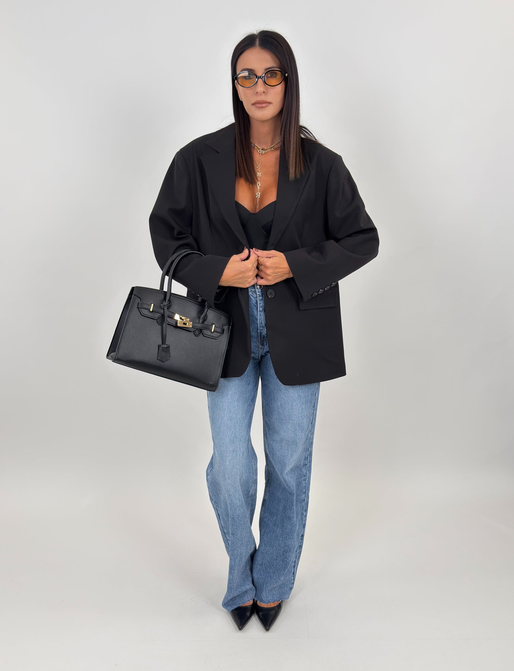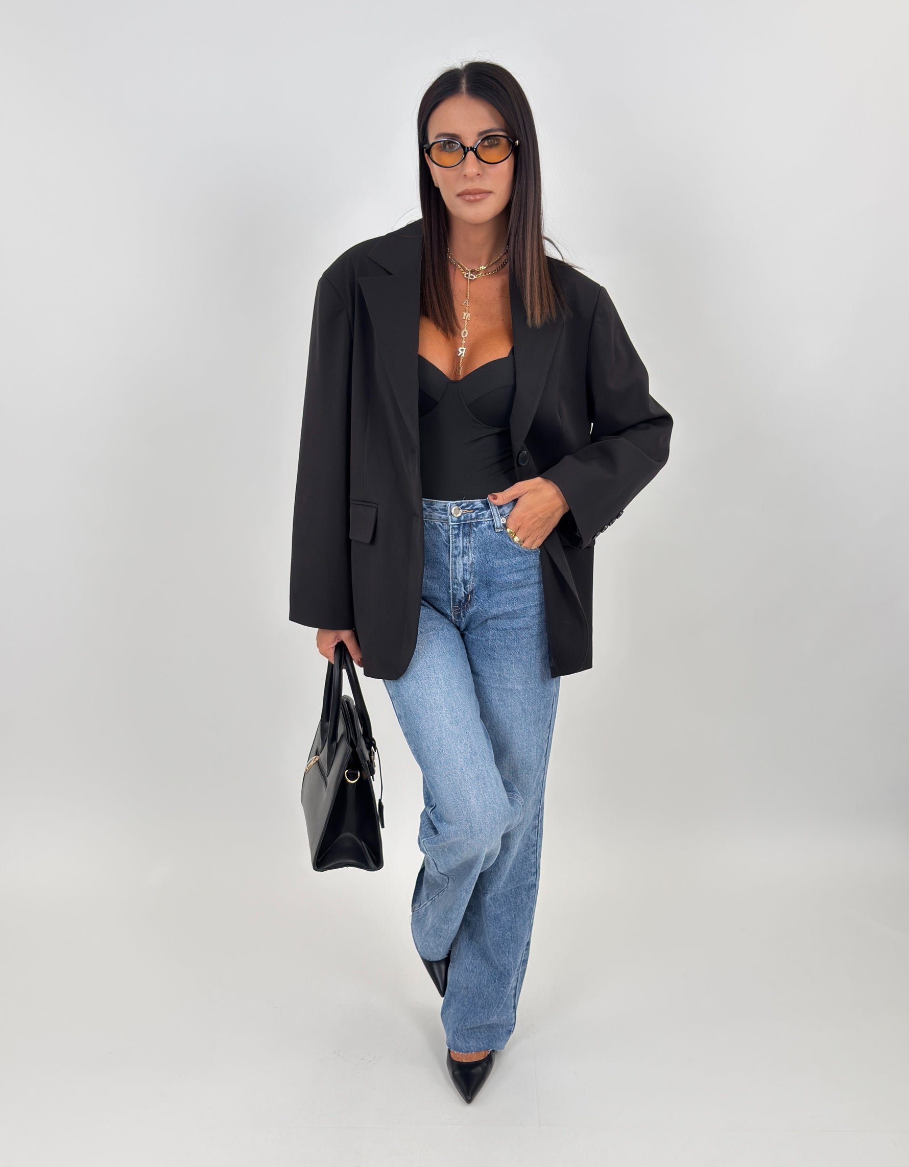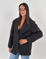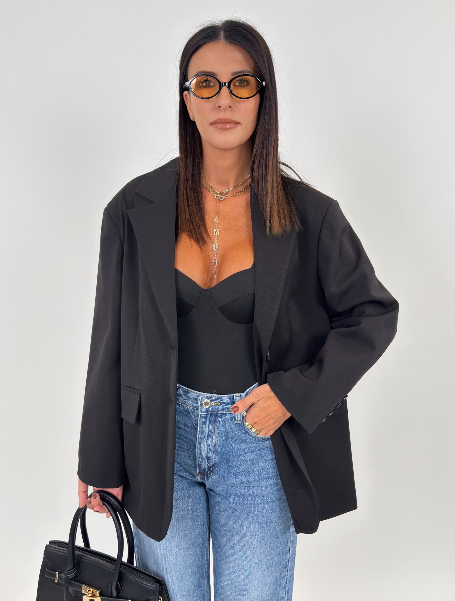 Giacca targata LUMINA, modello oversize monopetto con revers ampio, manica lunga con spallina imbottita e bottoni finali. Tasche frontali con patta e chiusura con due bottoni.