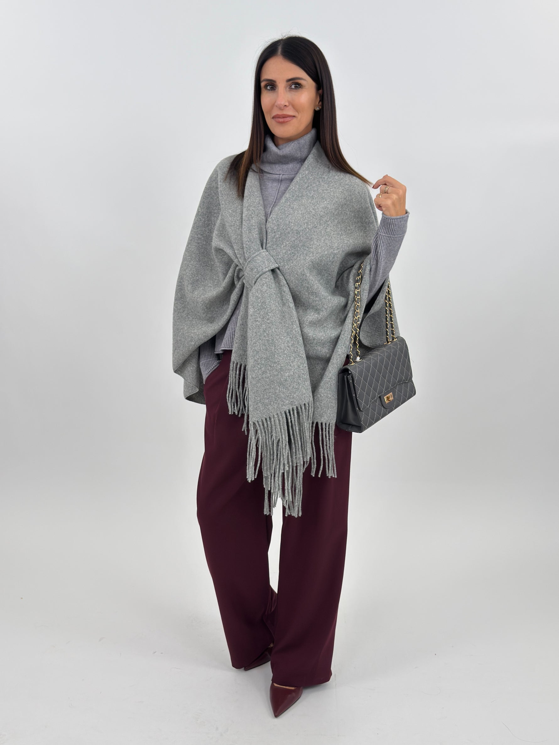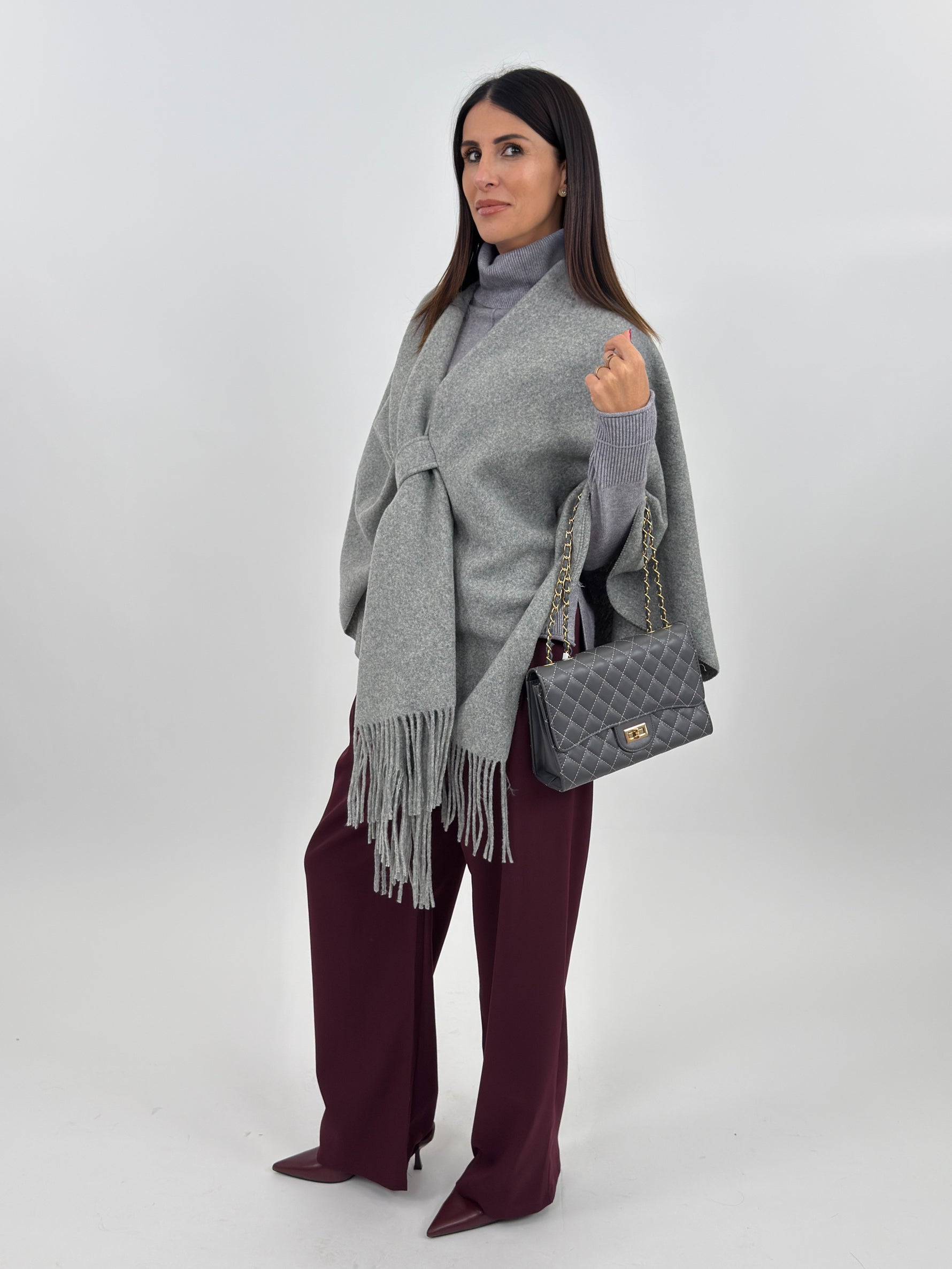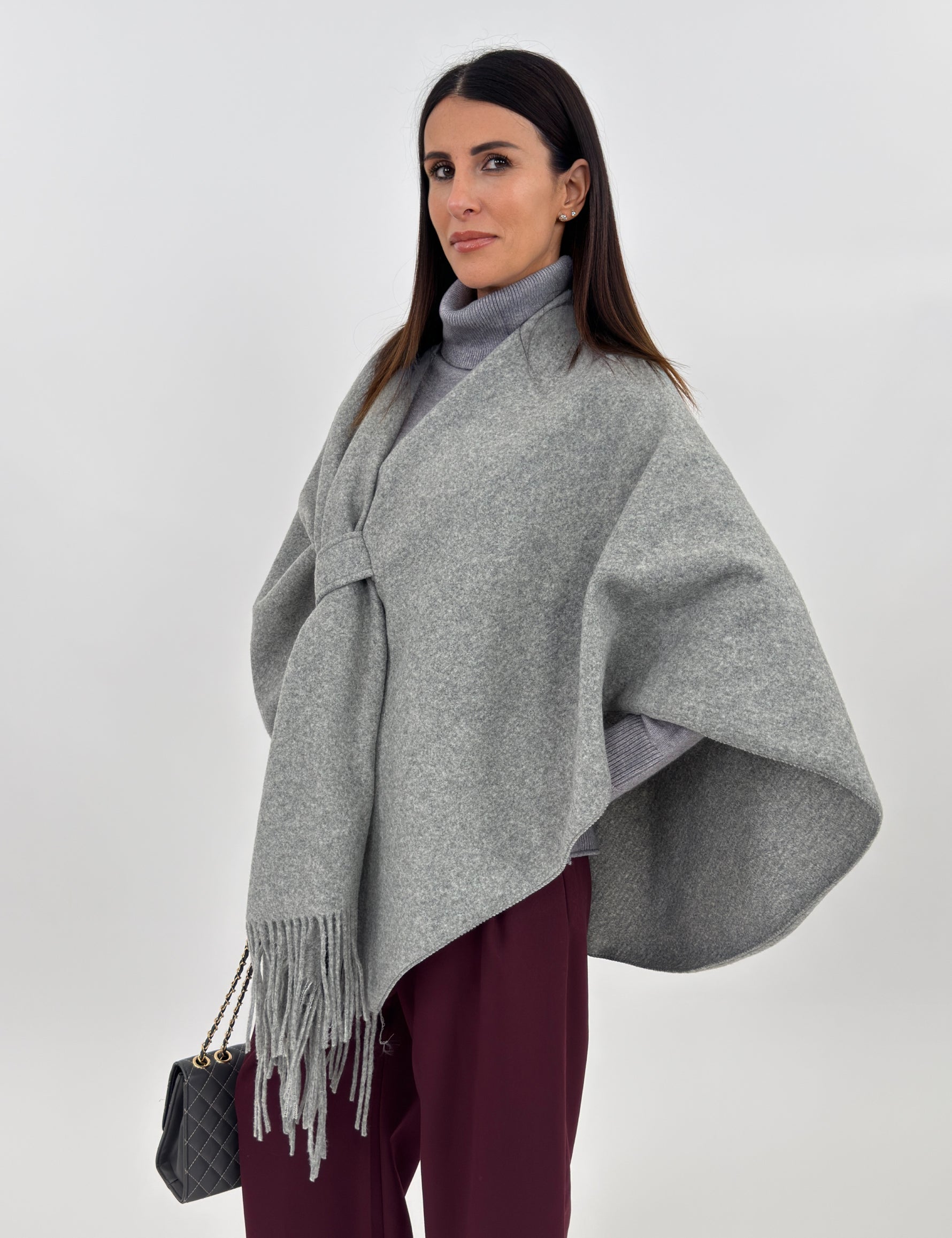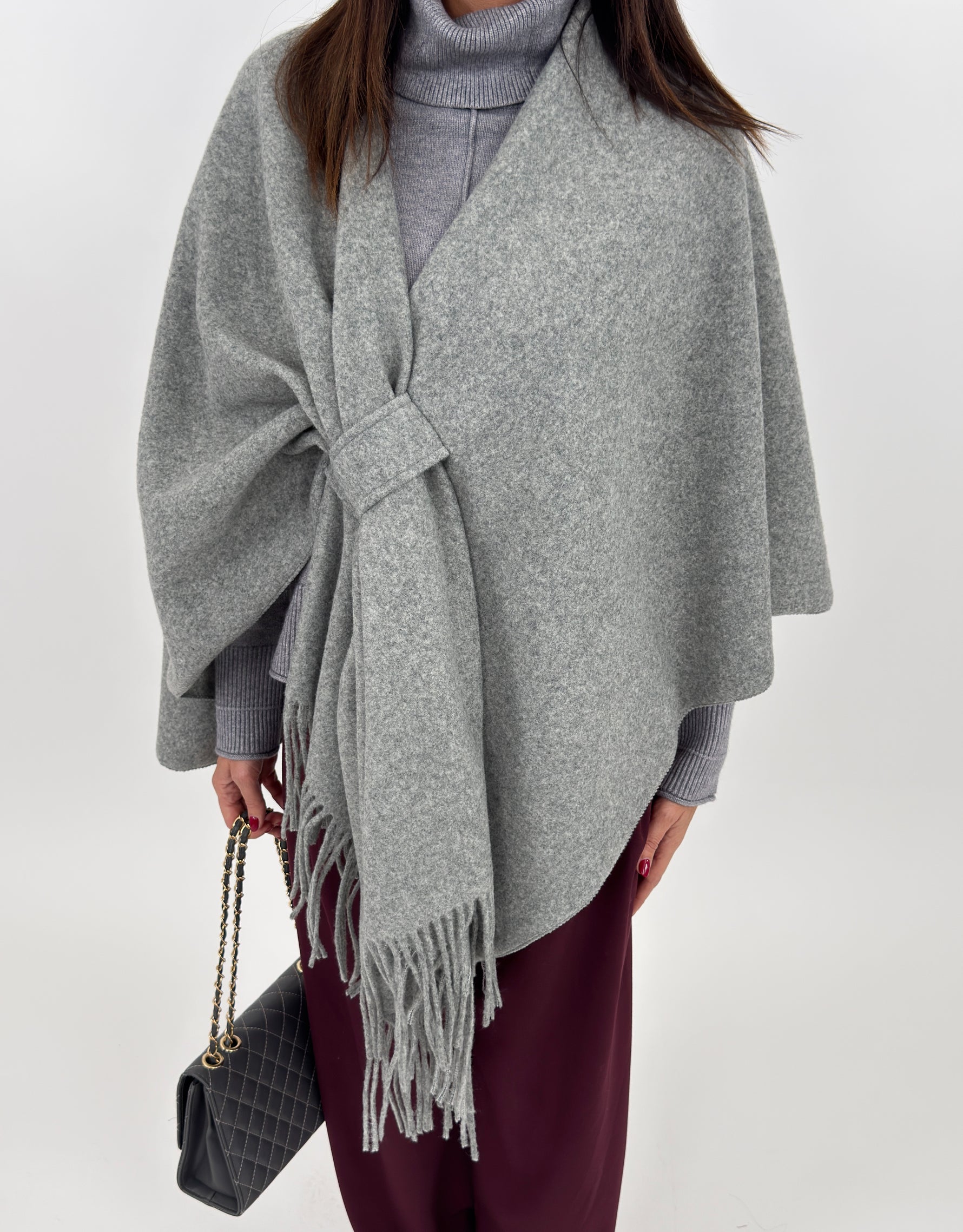 Mantella ampia con scollo a scialle e frange sul davanti.