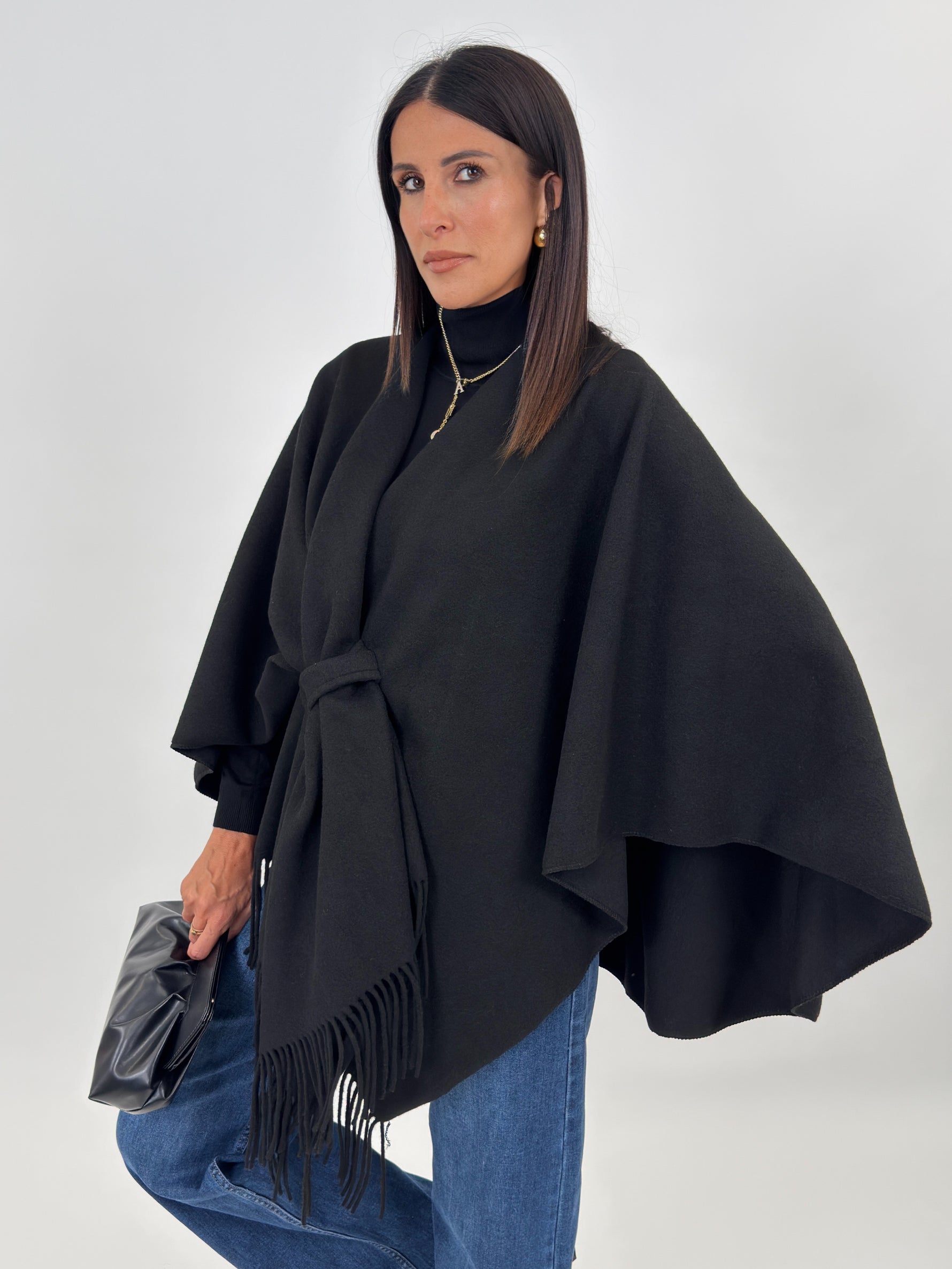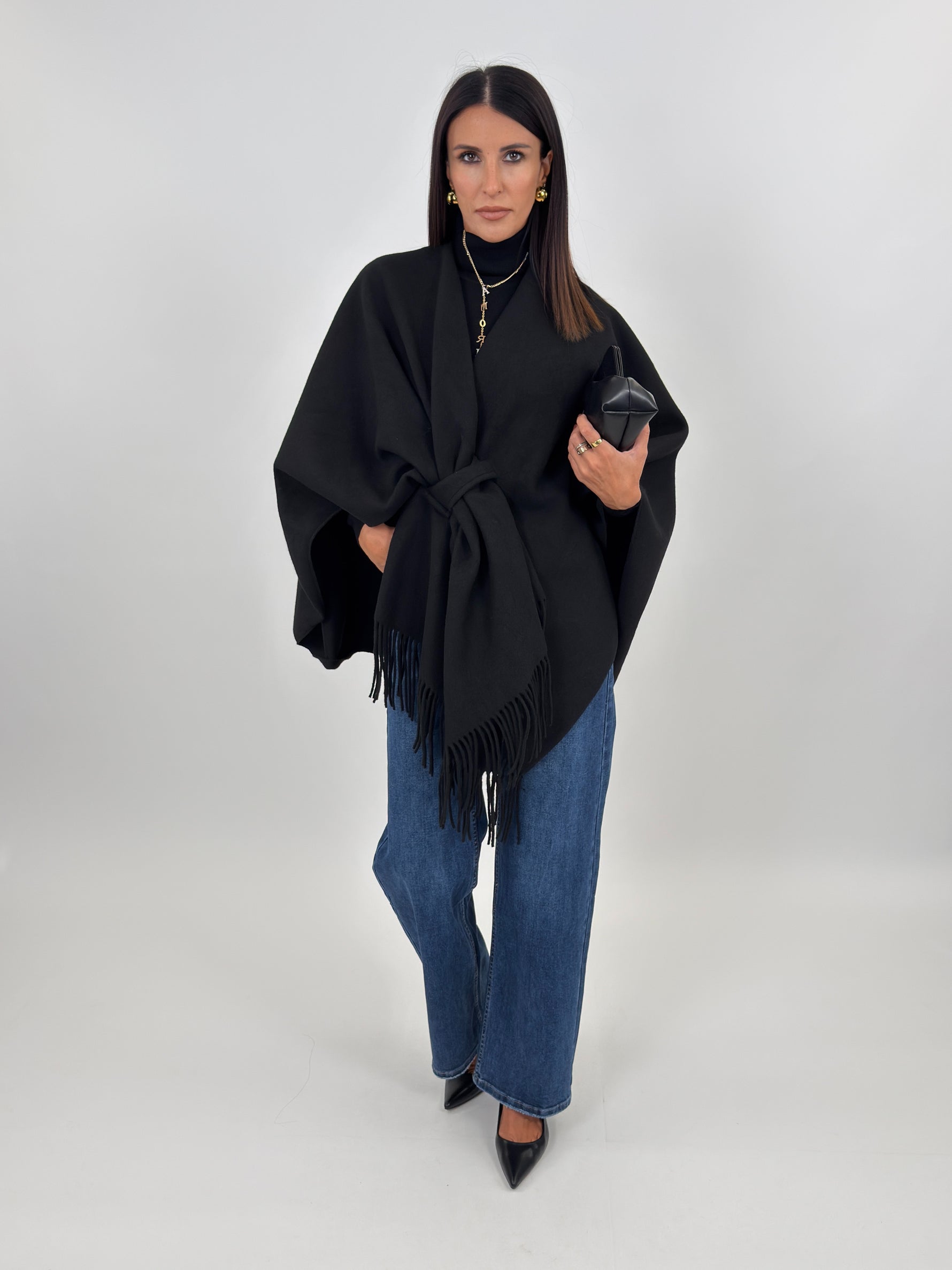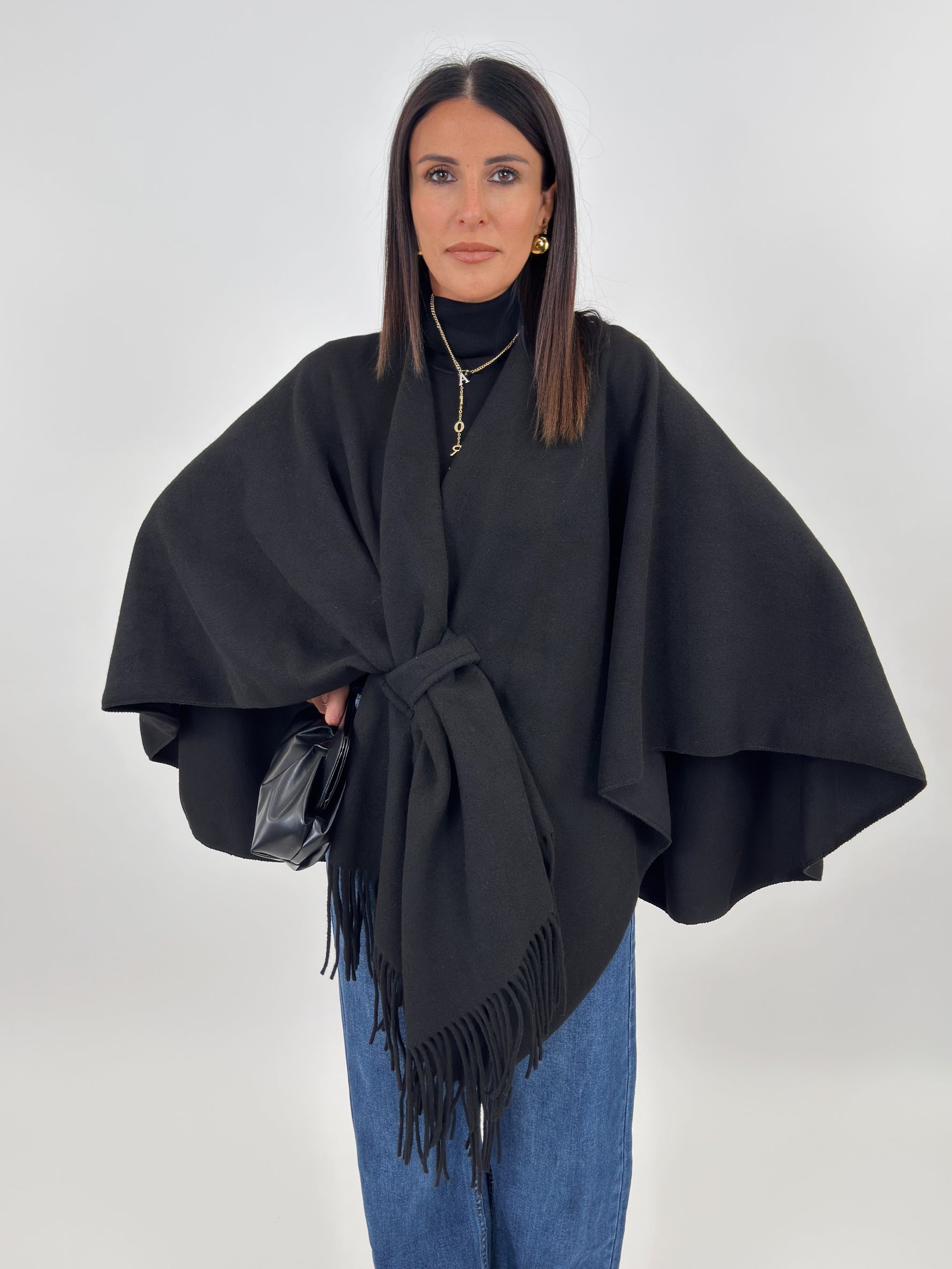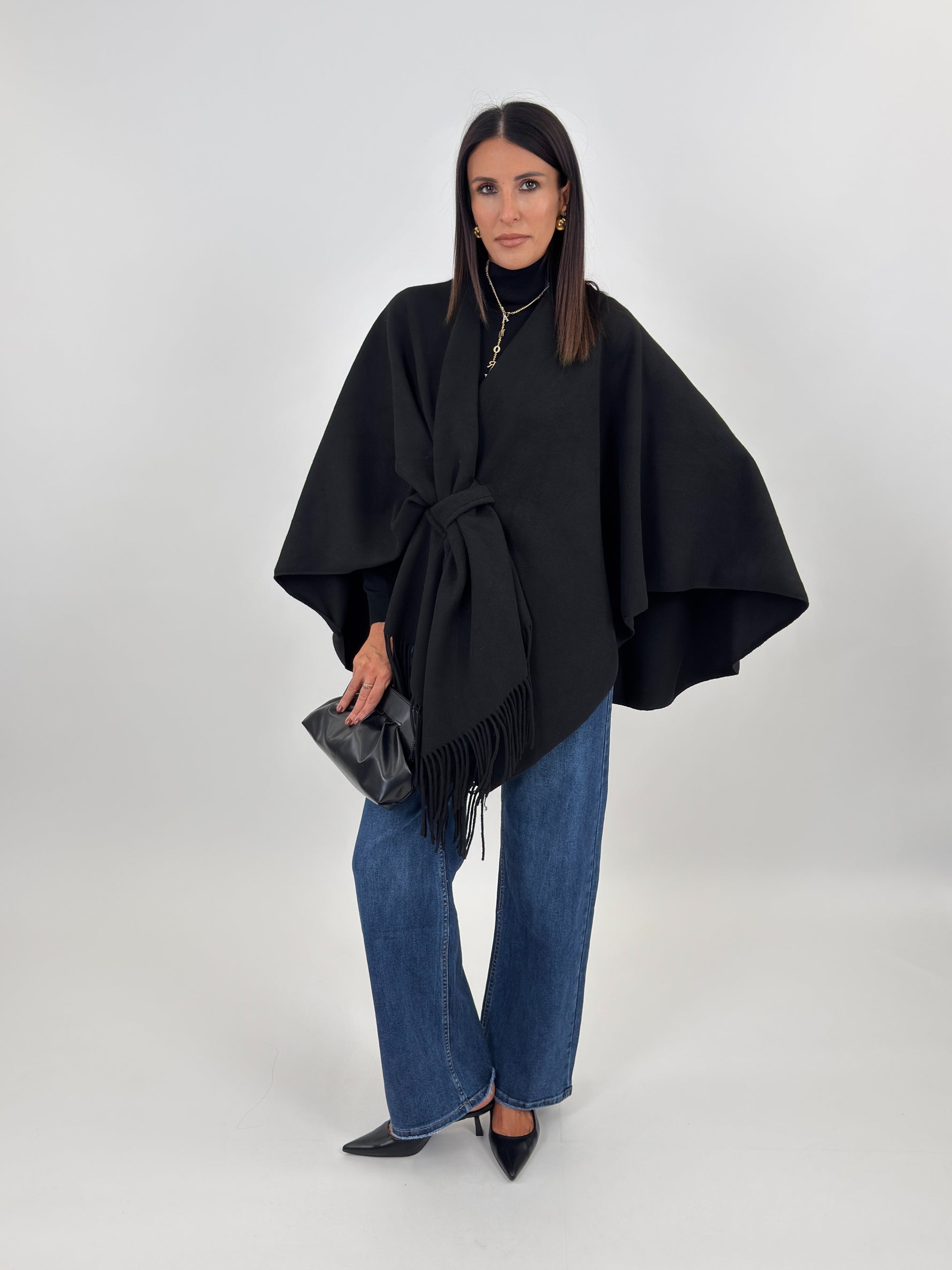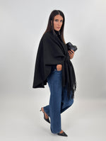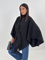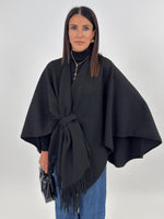 Mantella ampia con scollo a scialle e frange sul davanti.