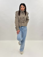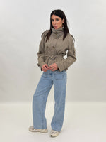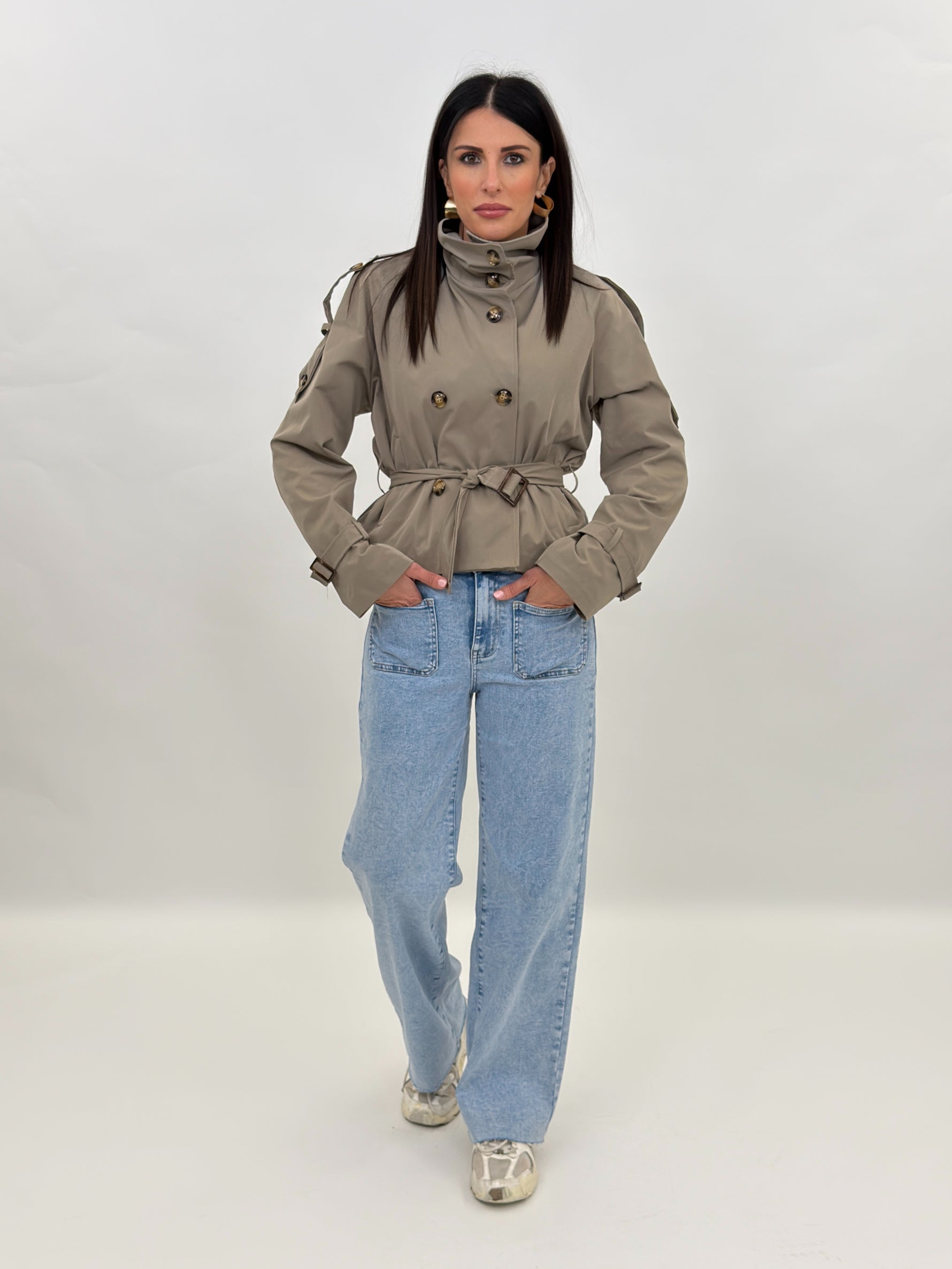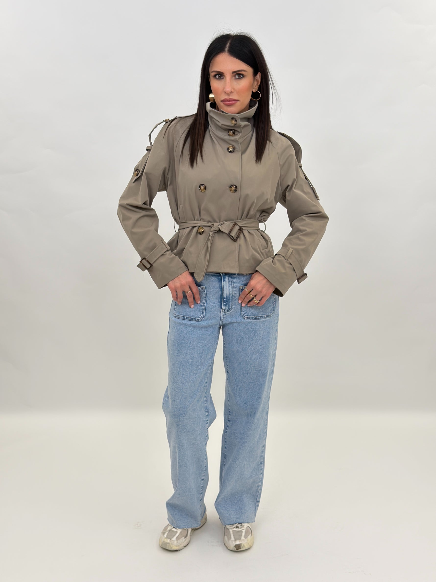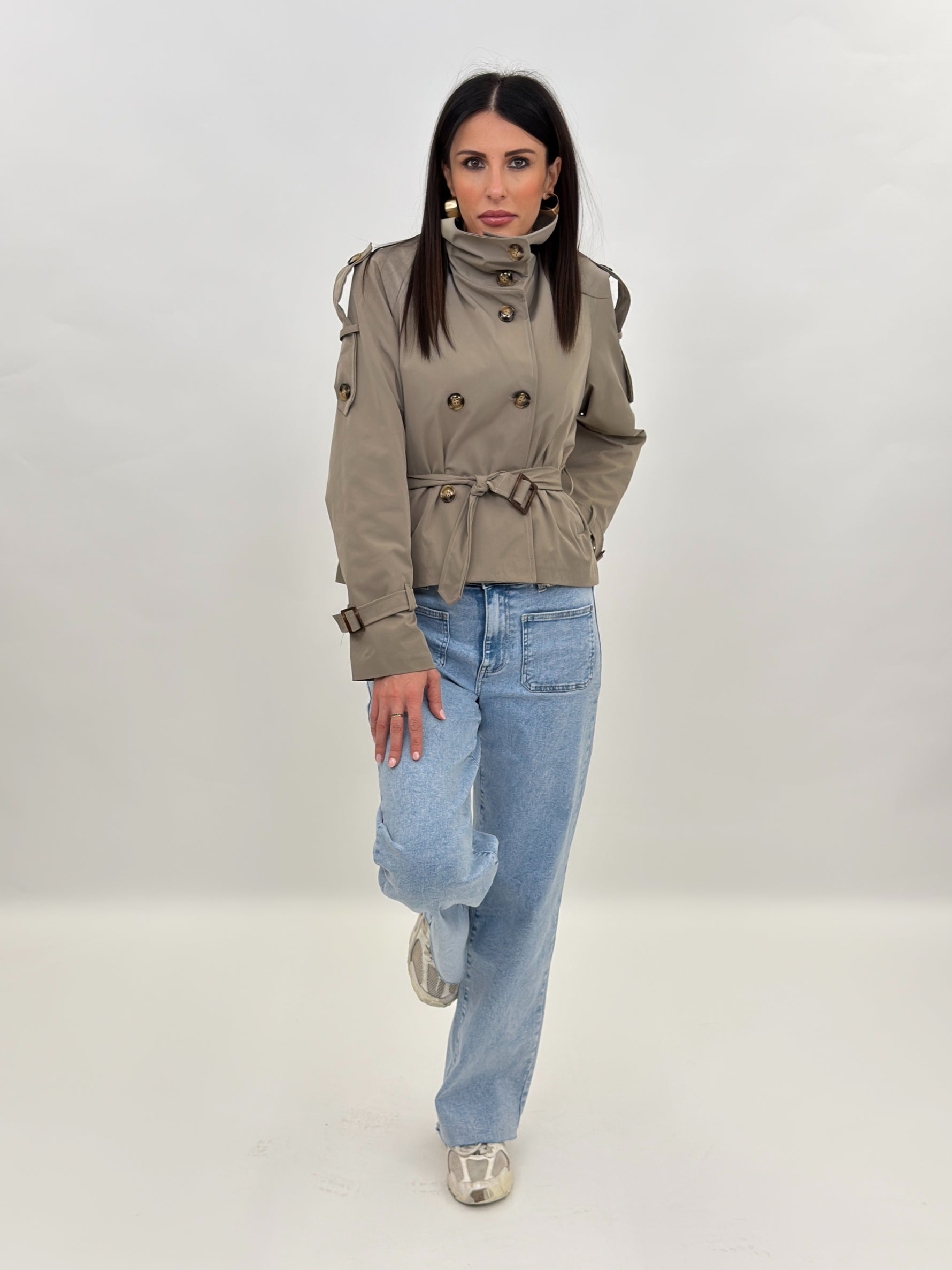 Trench modello corto a doppio petto con collo alto a listino con chiusura bottoni. Presenta maniche lunghe con passanti ai polsi e su spalle. Tasche frontali e chiusura con bottoni e cintura da annodare in vita. Fodera interna.