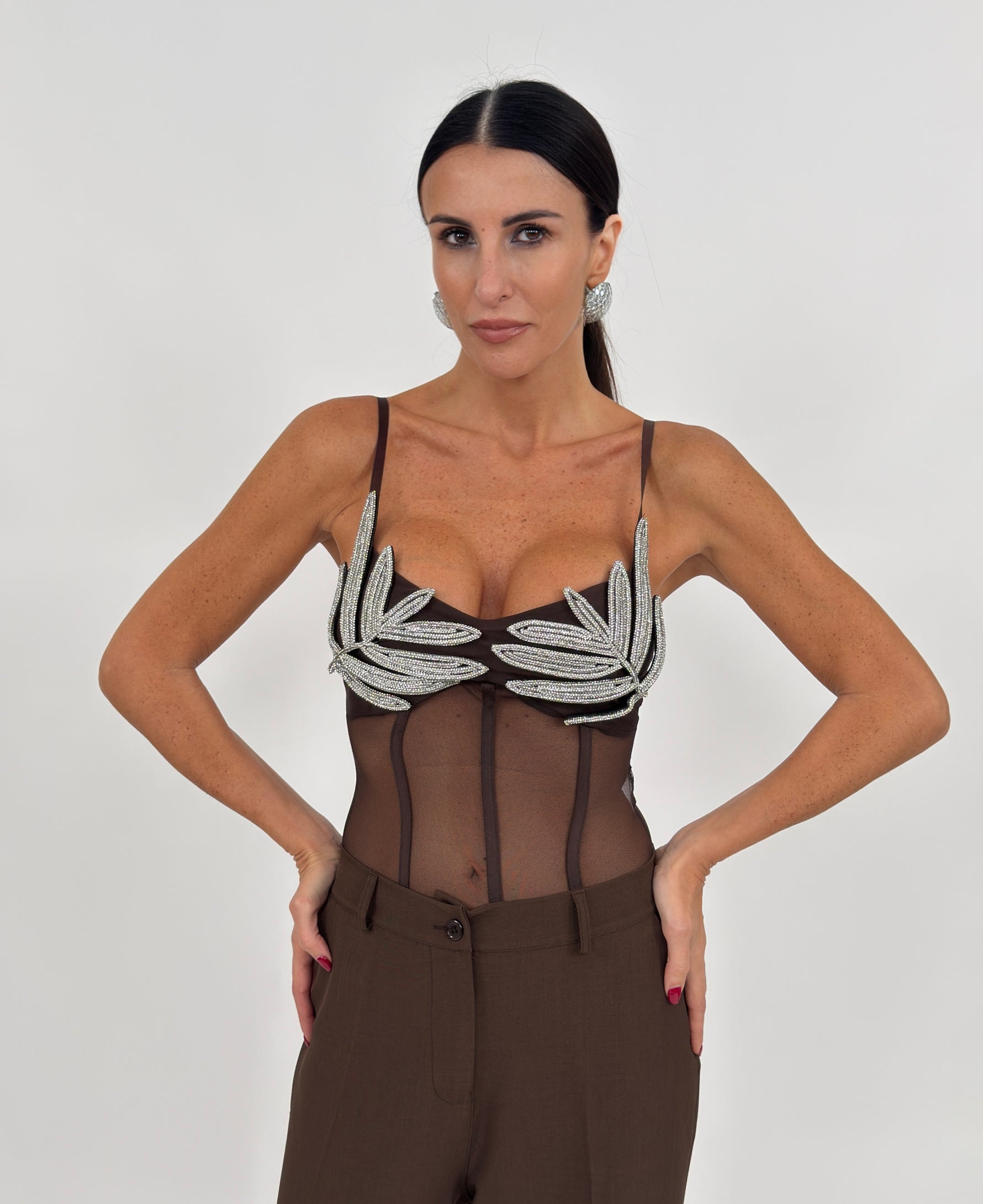 Body in effetto velato con applicazioni strass sul d'avanti e spalline sottili regolabili.