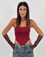 Top modello bustier con stecche, senza spalline, in effetto lycra.