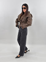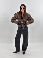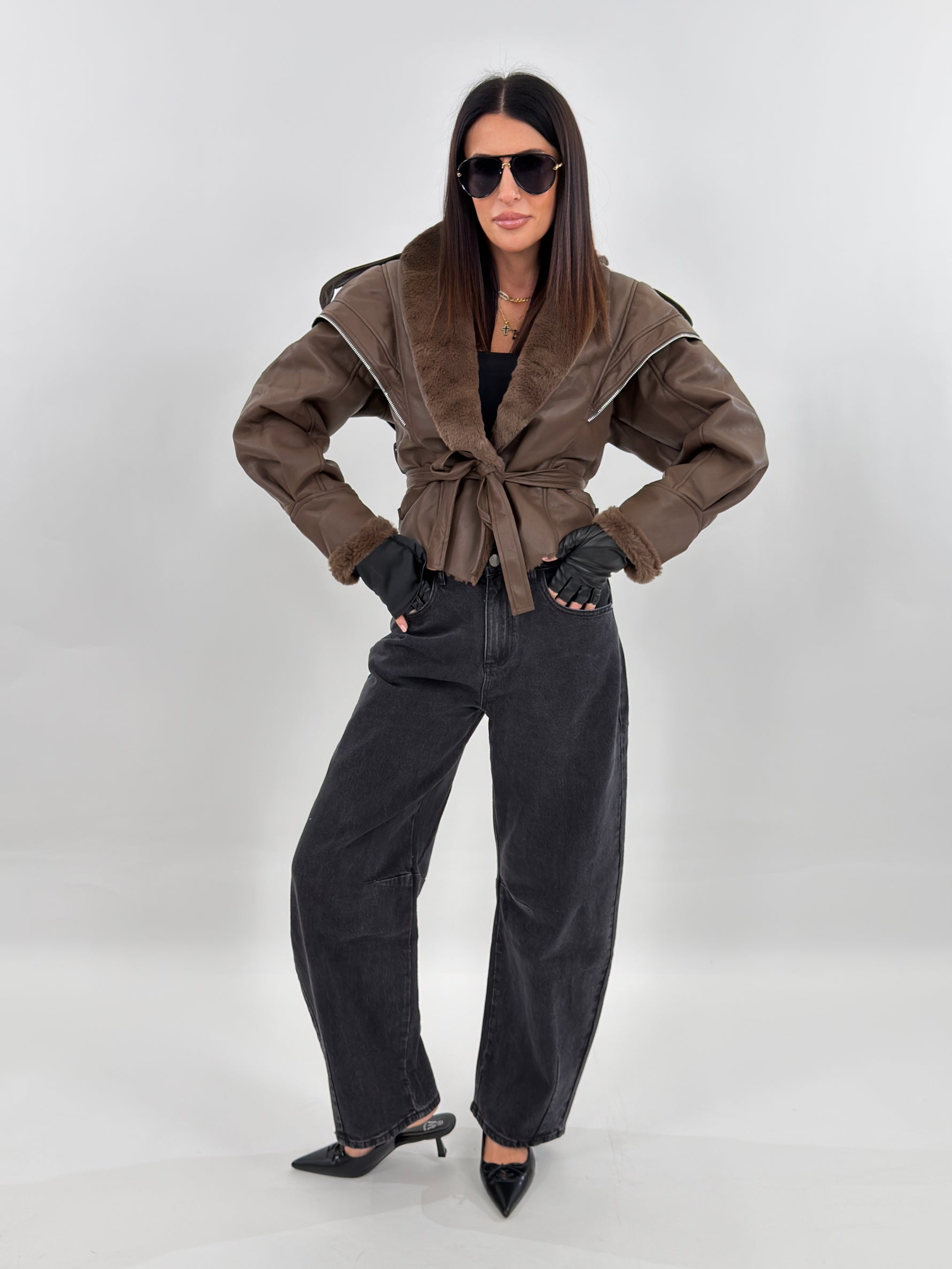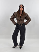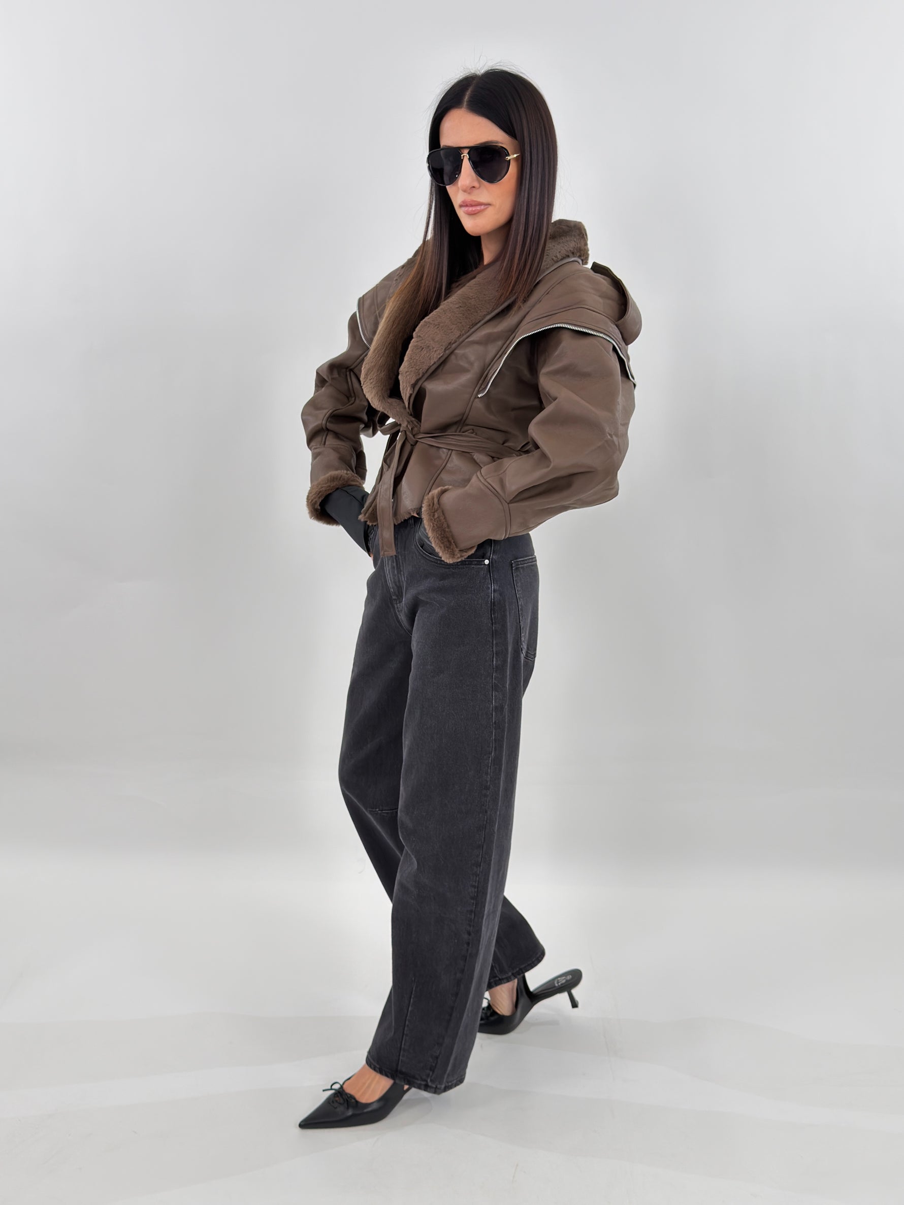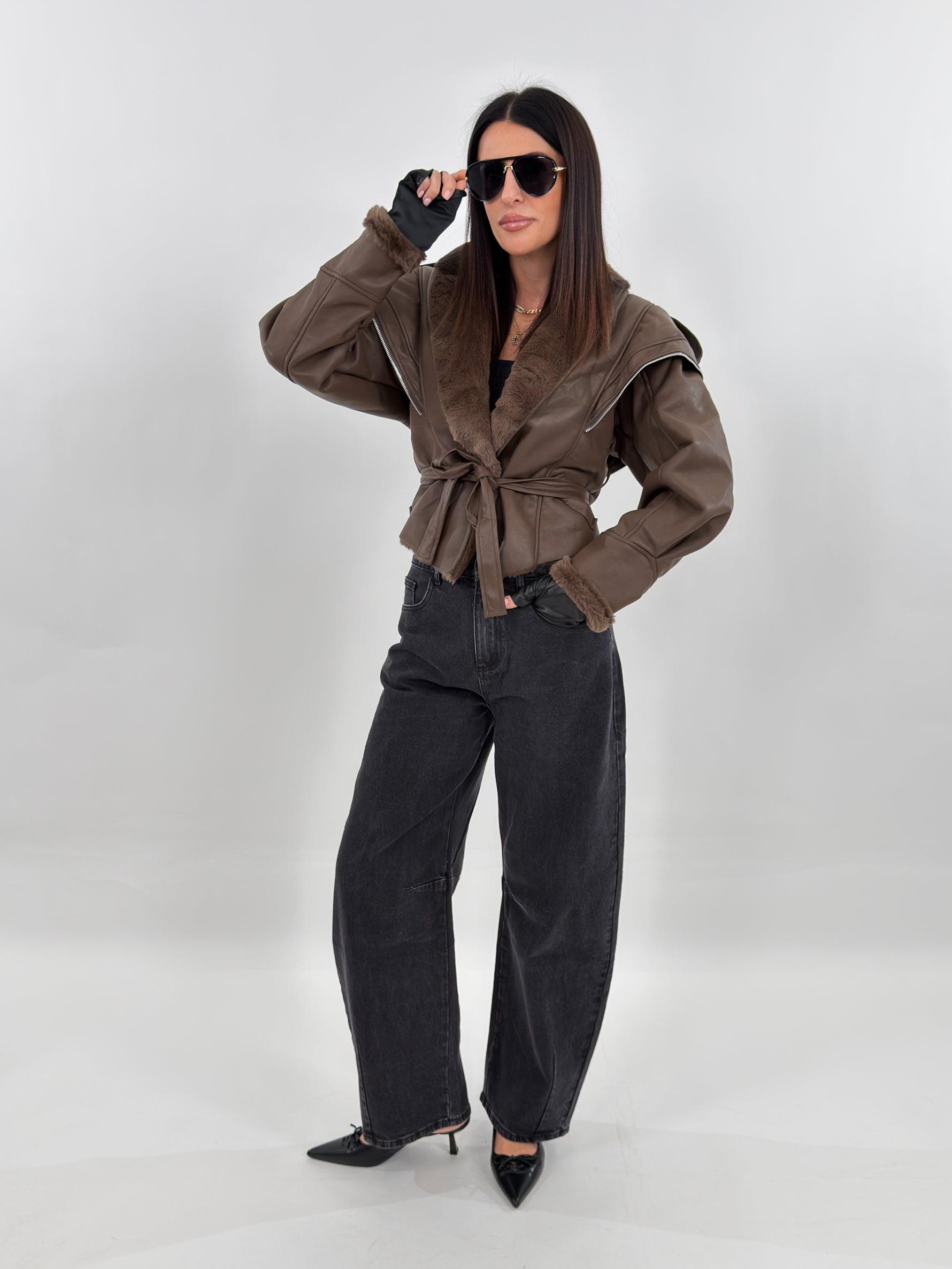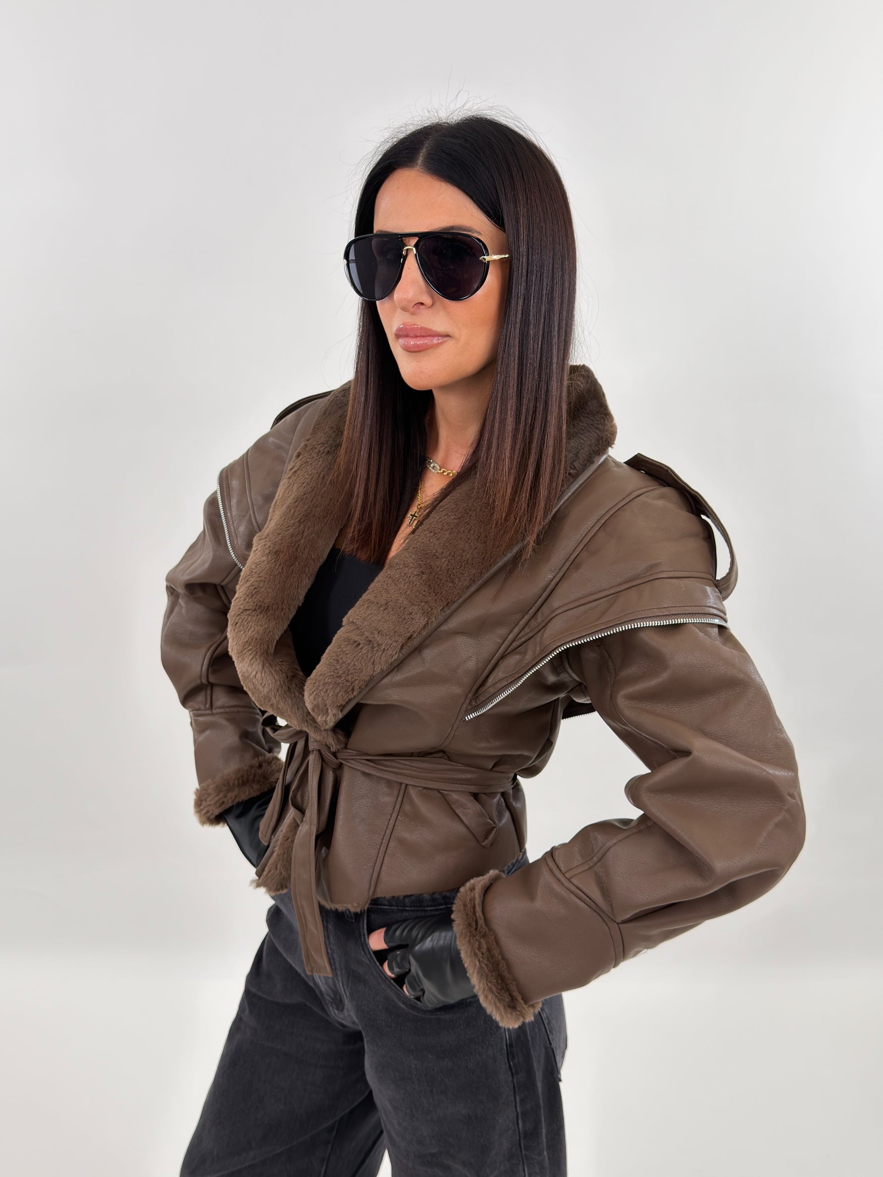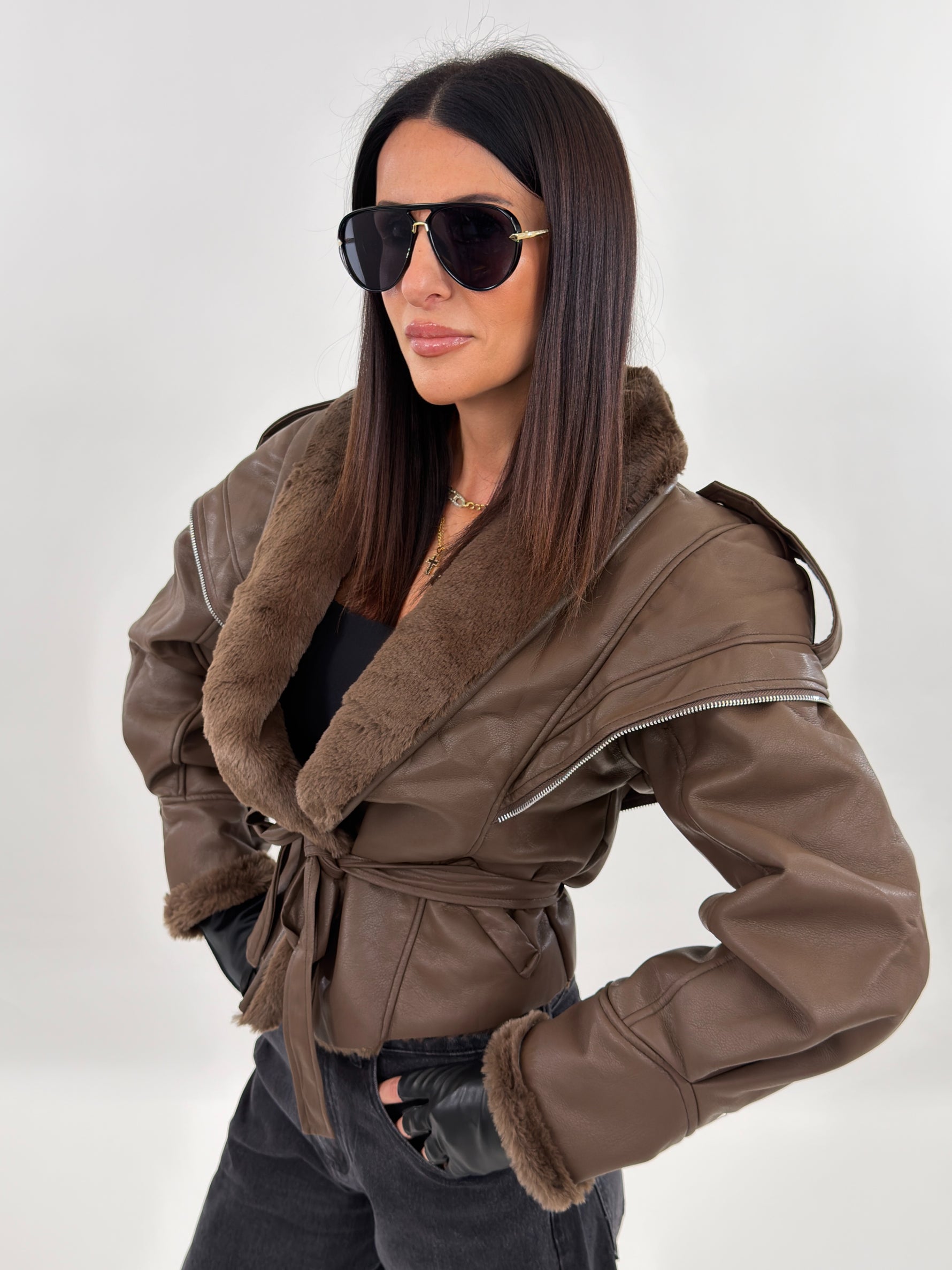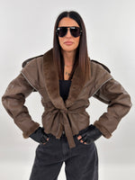Giubbotto modello in montone. Si presenta esternamente in tessuto ecopelle ed internamente foderato in ecopelliccia. Maniche lunghe ampie e chiusura frontale con passanti e cintura da annodare.