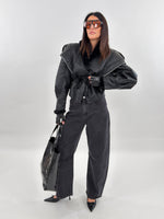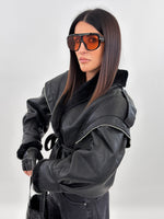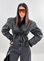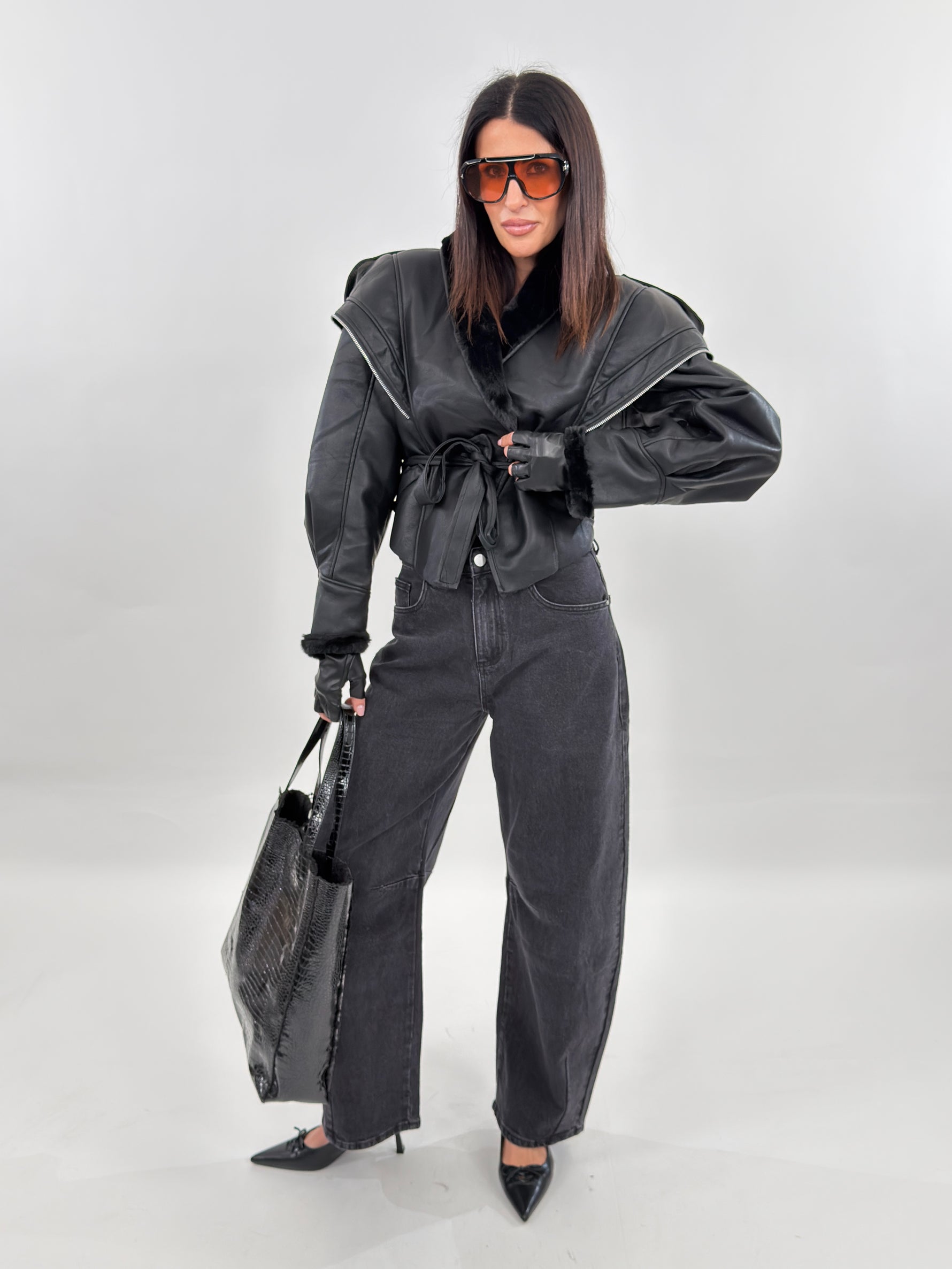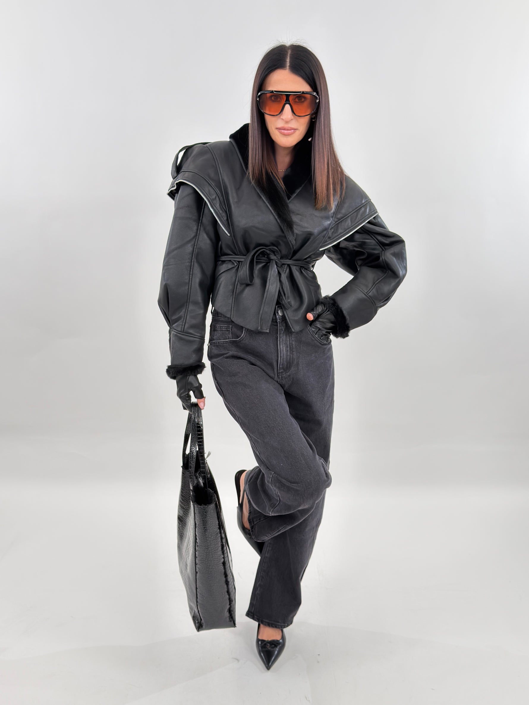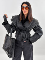 Giubbotto modello in montone. Si presenta esternamente in tessuto ecopelle ed internamente foderato in ecopelliccia. Maniche lunghe ampie e chiusura frontale con passanti e cintura da annodare.