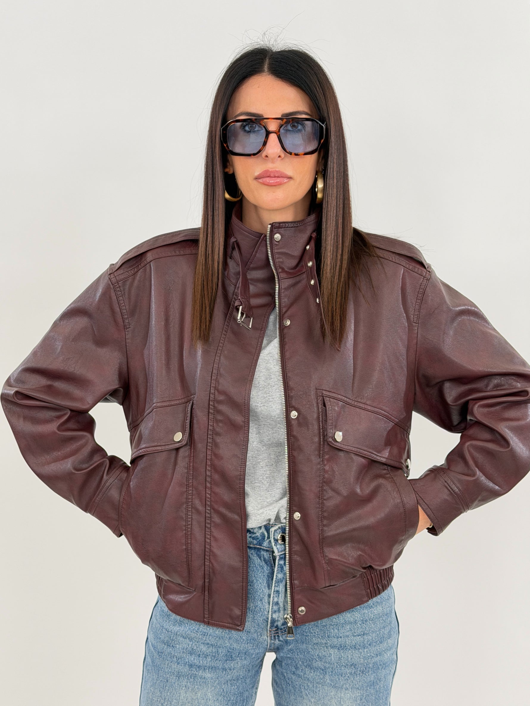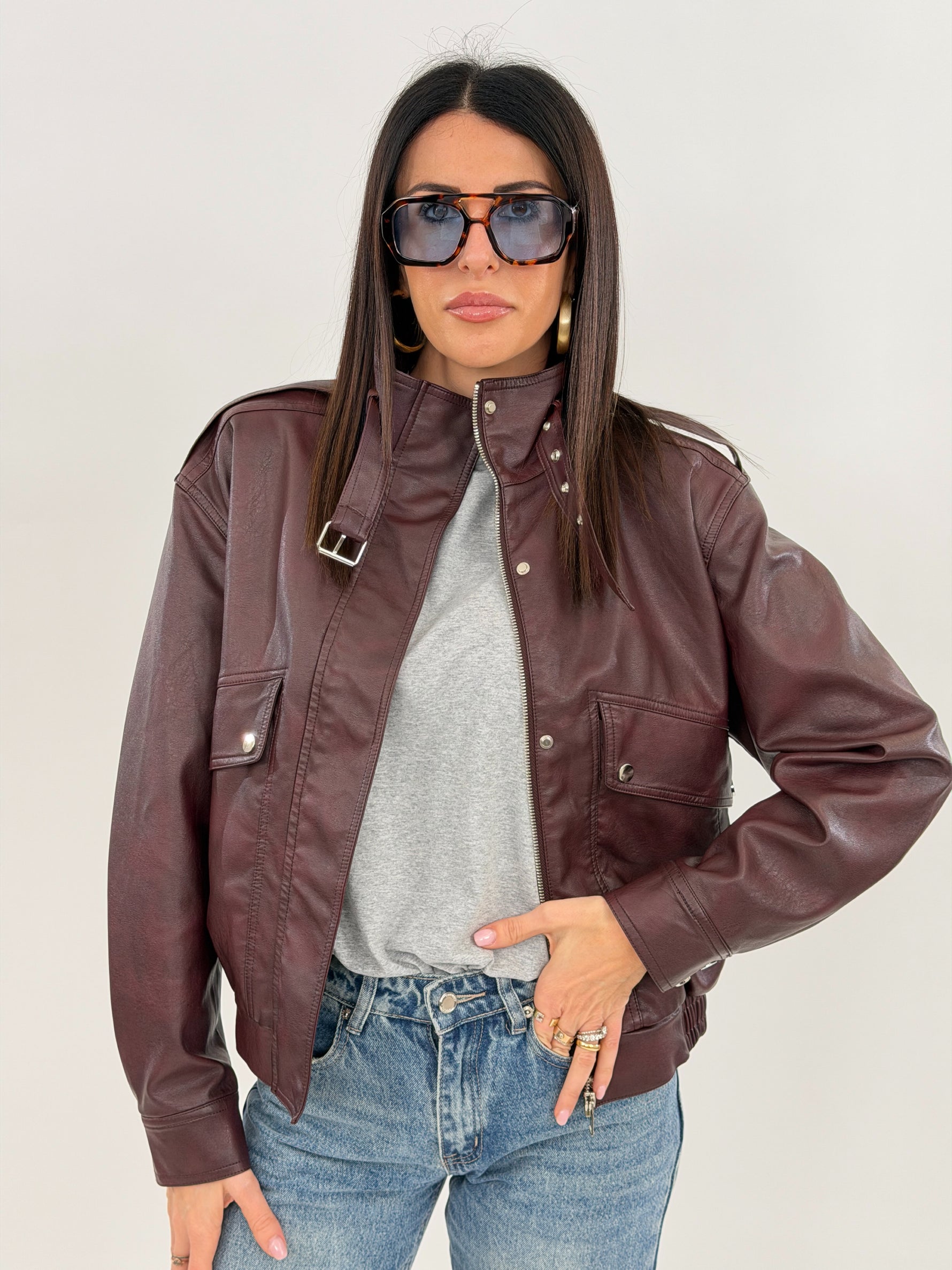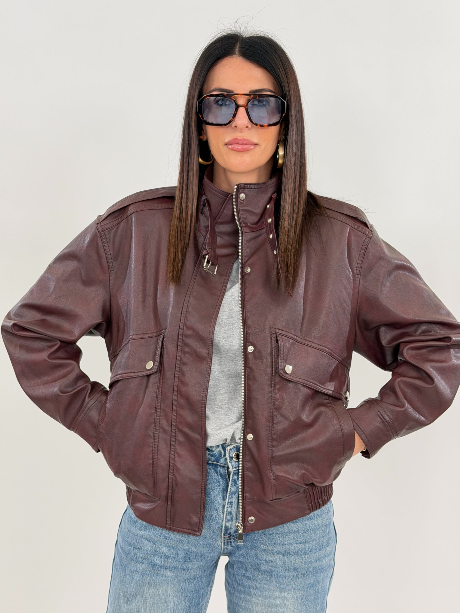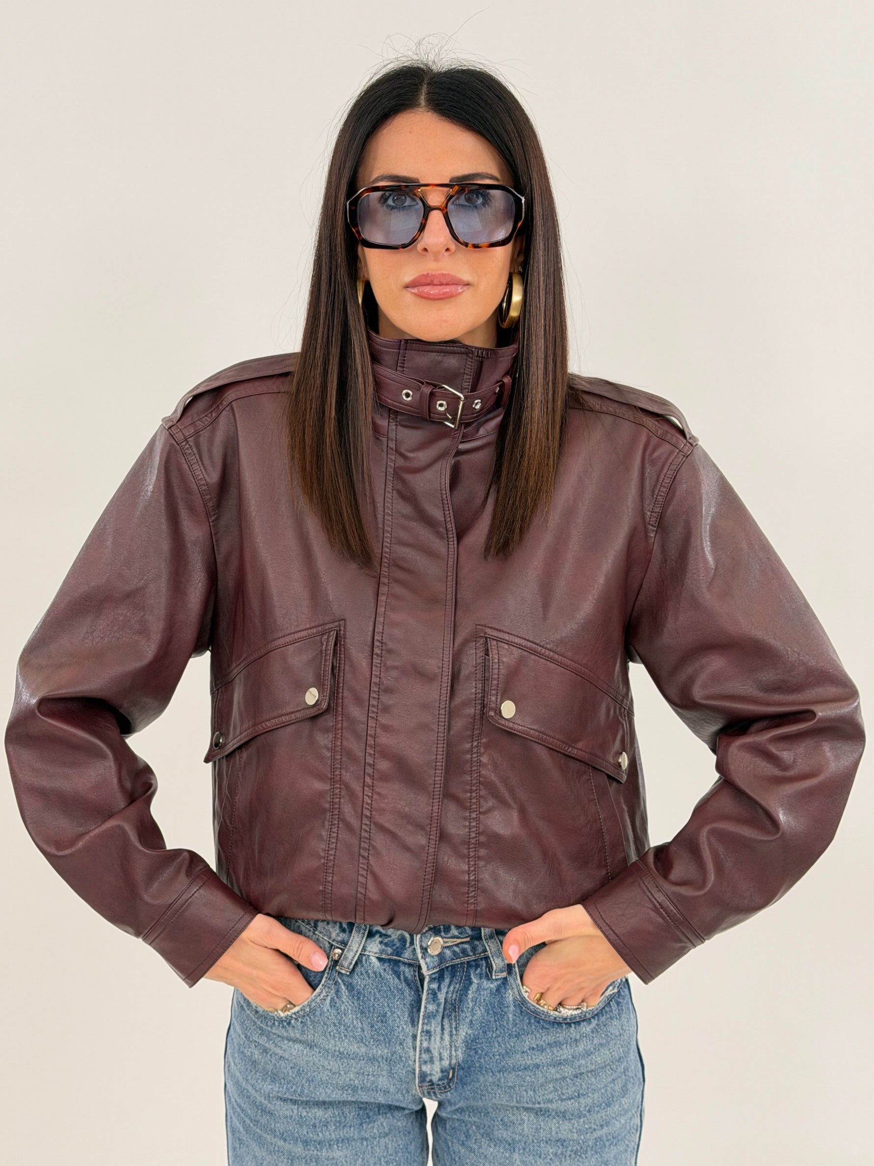 Giubbotto in tessuto ecopelle ed internamente foderato. Maniche lunghe, tasconi frontali e tasche laterali. Chiusura frotale con zip e bottoni a pressione. Fondo elastico sul retro.