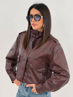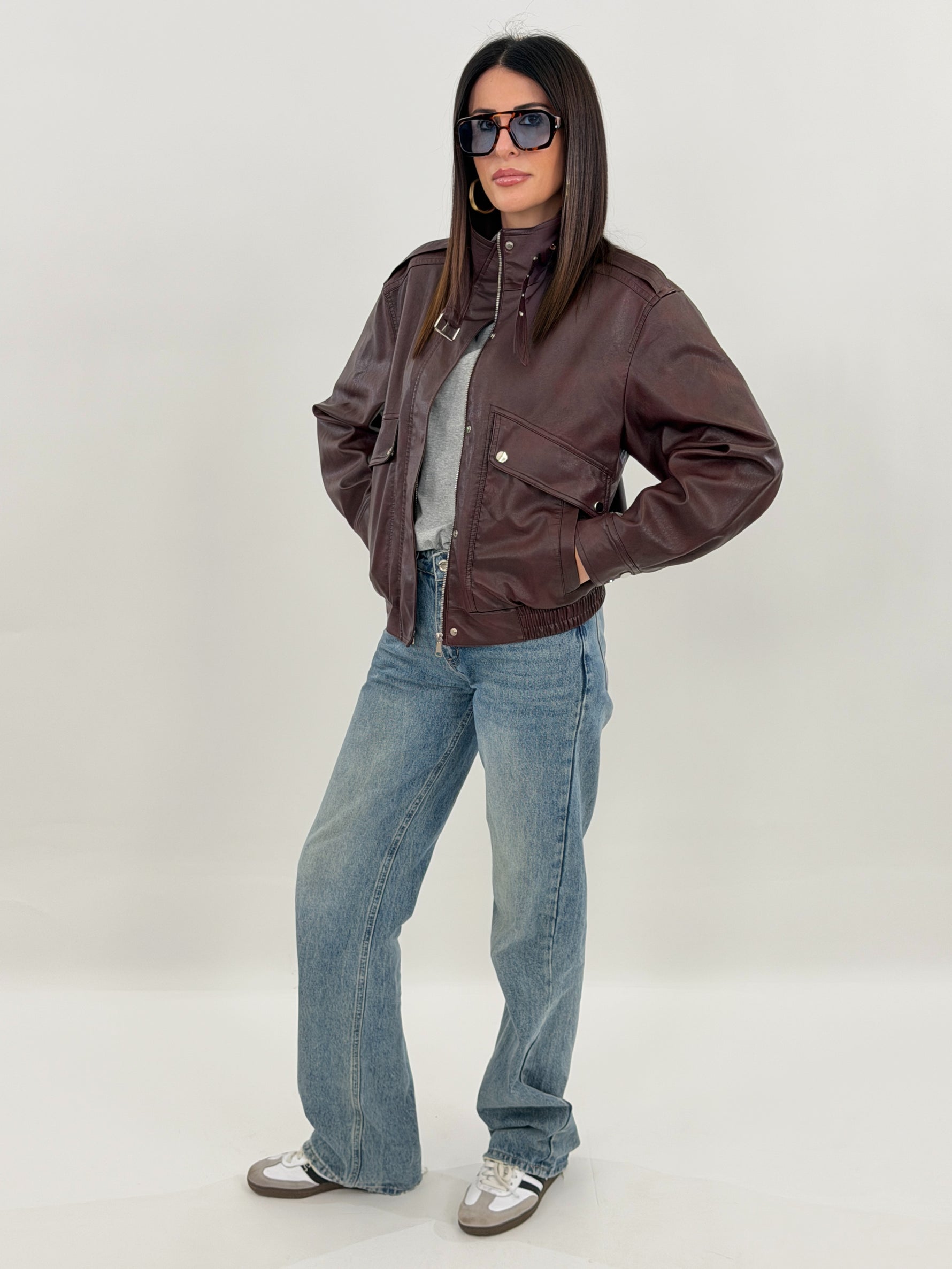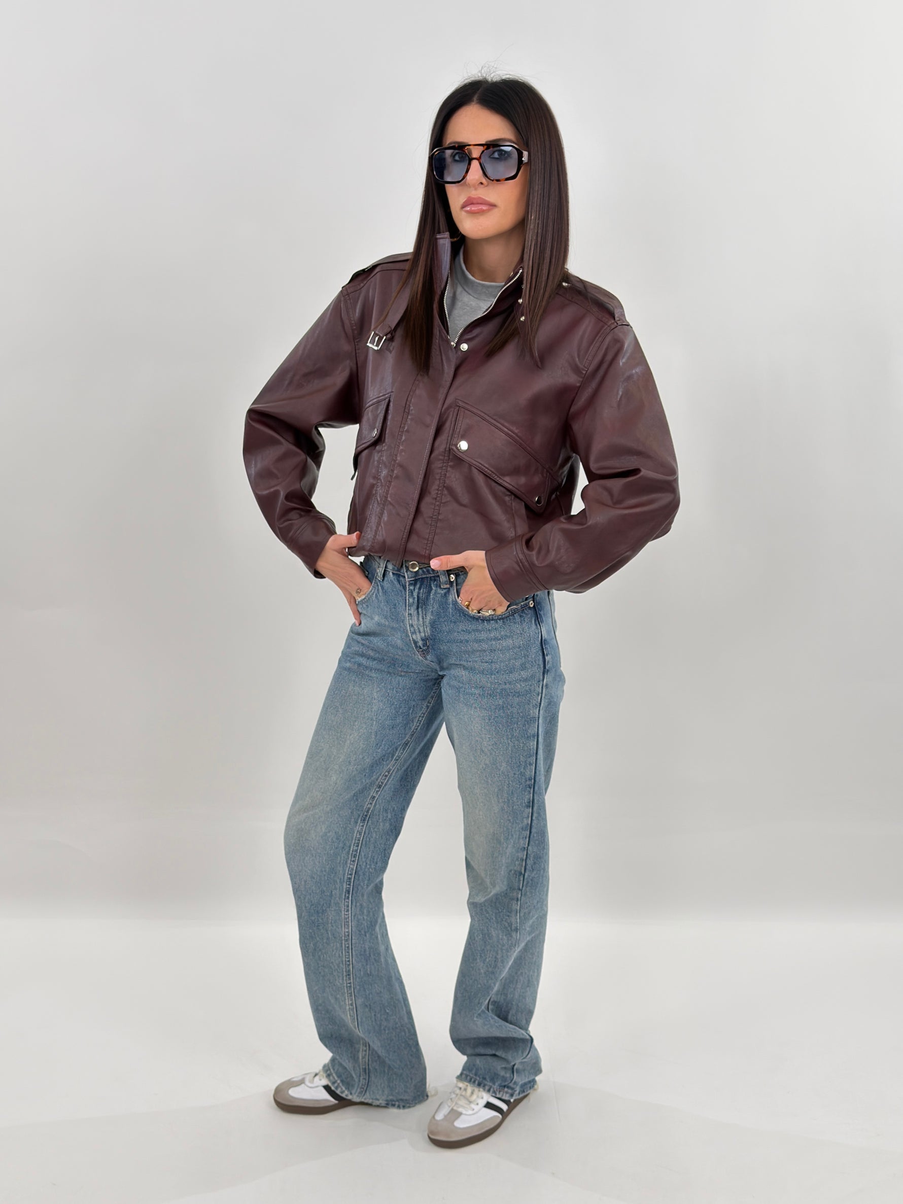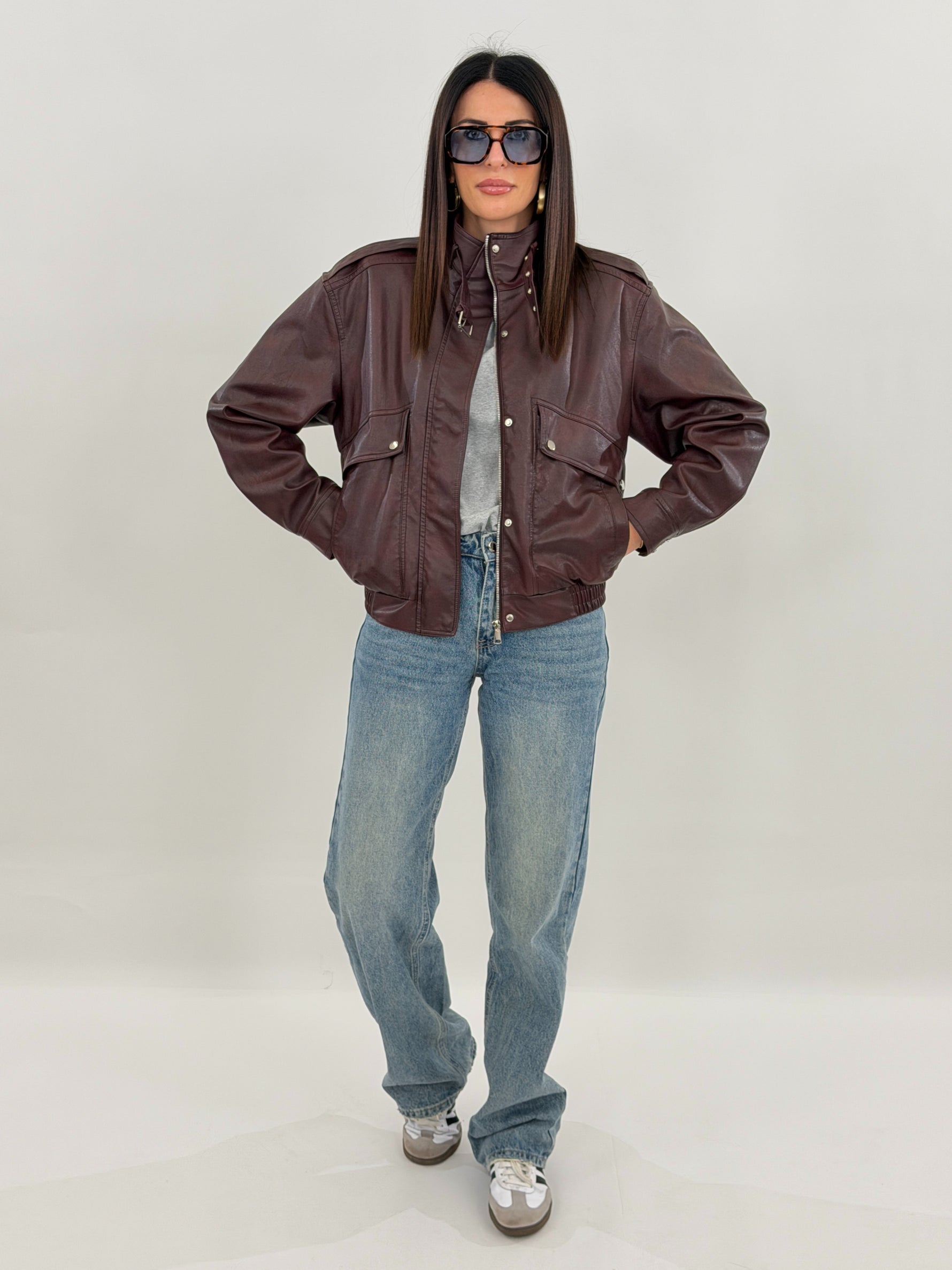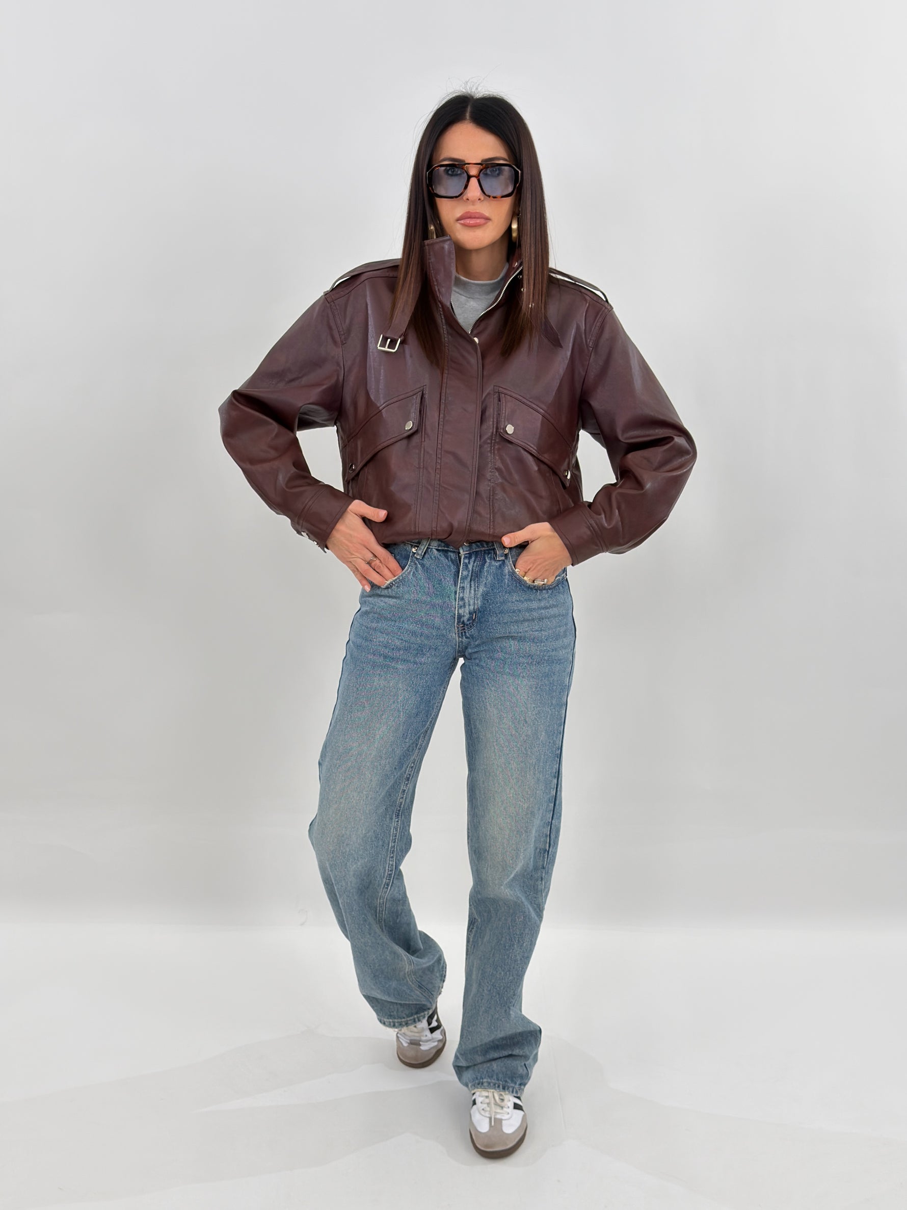 Giubbotto in tessuto ecopelle ed internamente foderato. Maniche lunghe, tasconi frontali e tasche laterali. Chiusura frotale con zip e bottoni a pressione. Fondo elastico sul retro.