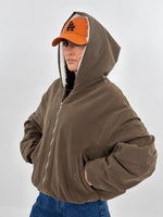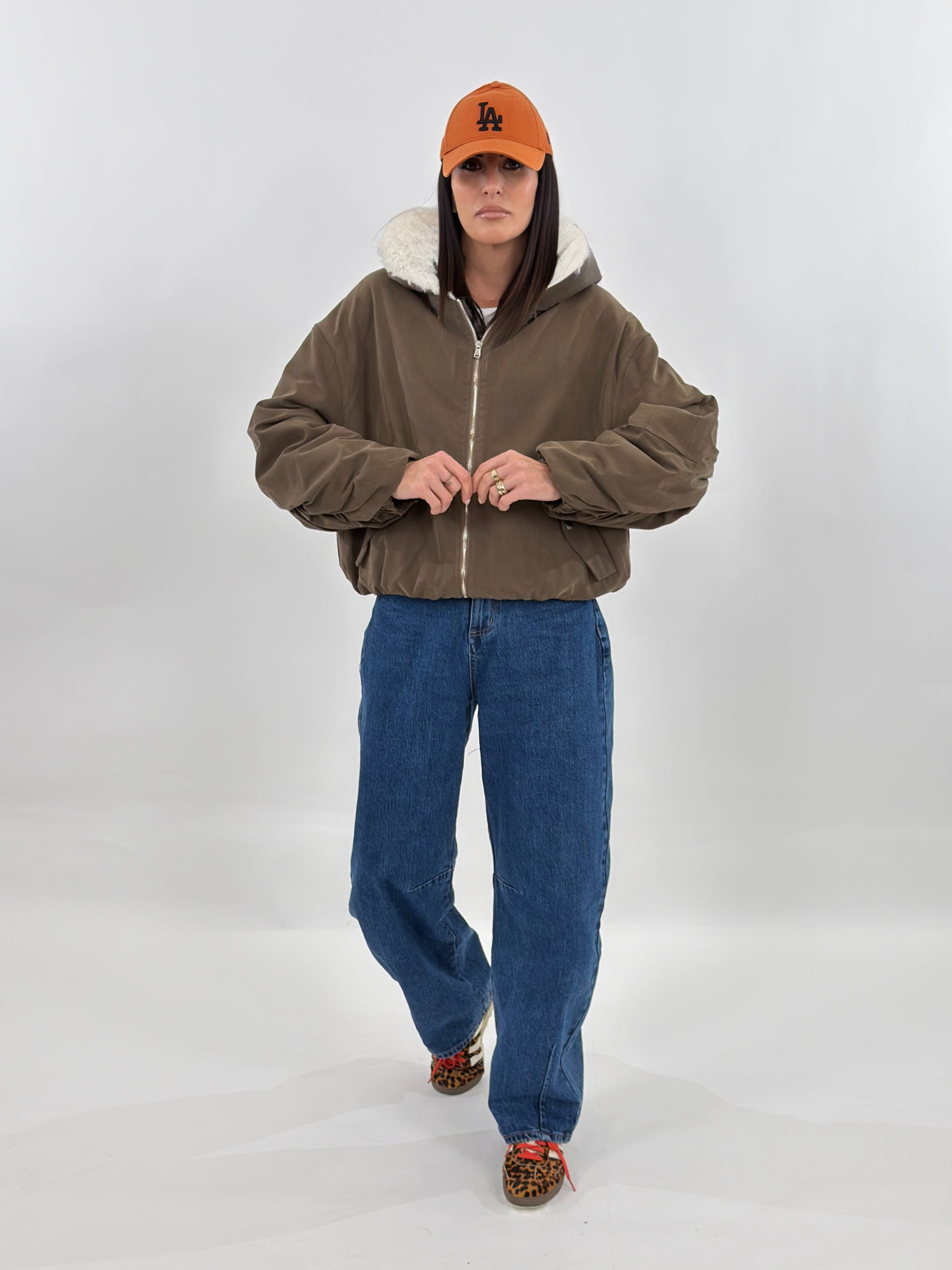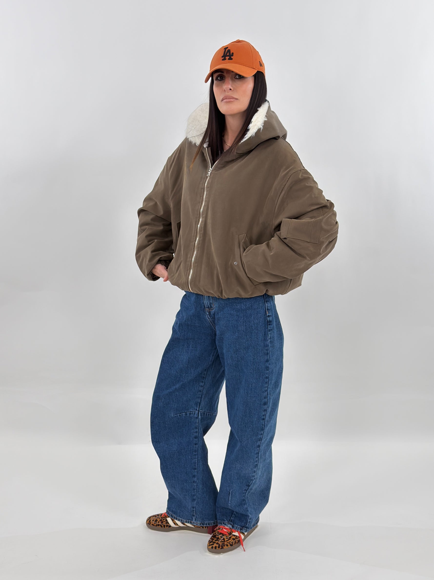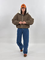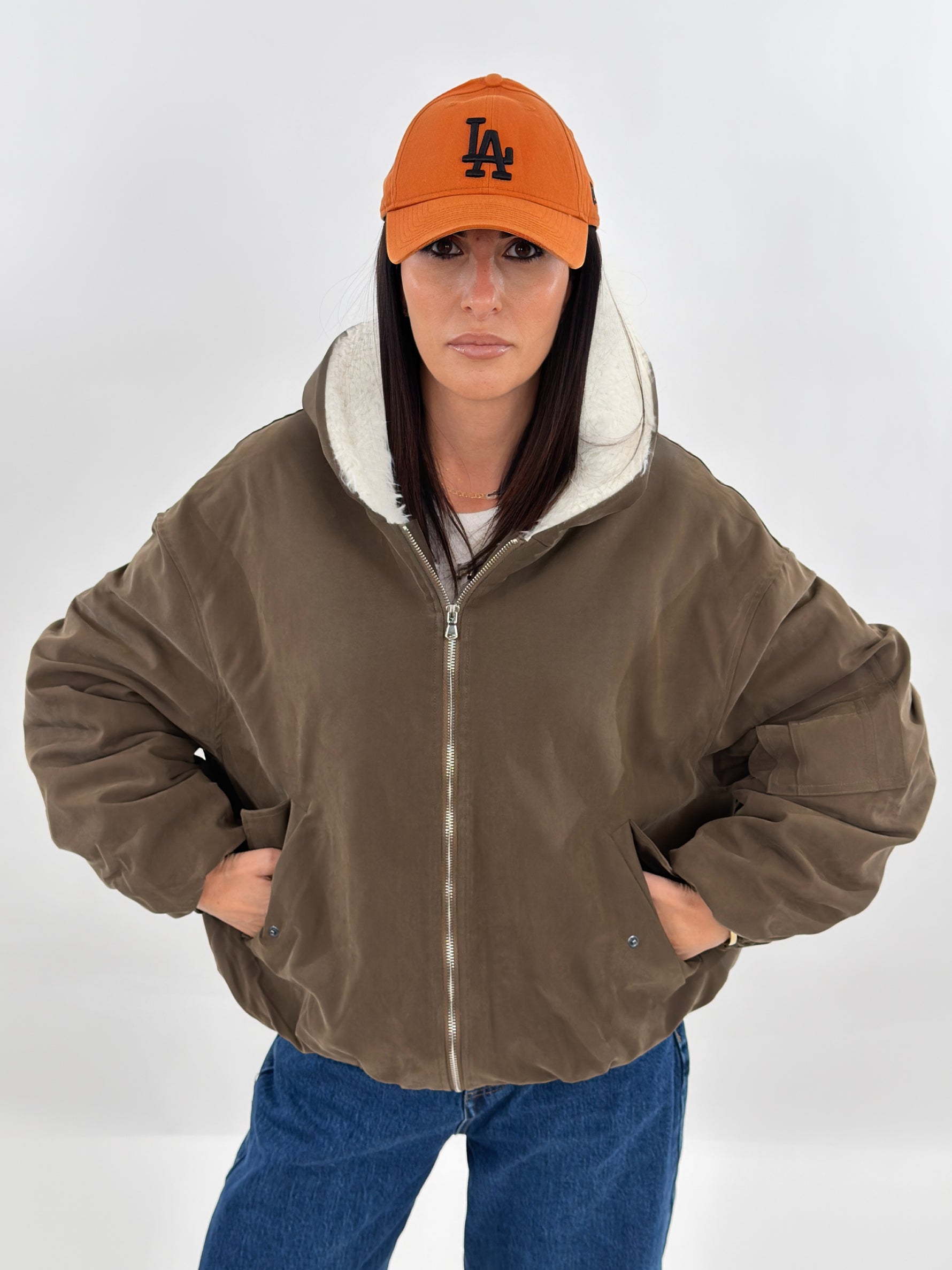 Giubbotto targato LUMINA, modello bomber con cappuccio ed elastico sul fondo. Arricciature su maniche e polsino elastico. Tasche frontali e chiusura con zip. Interno foderato in ecopelliccia.