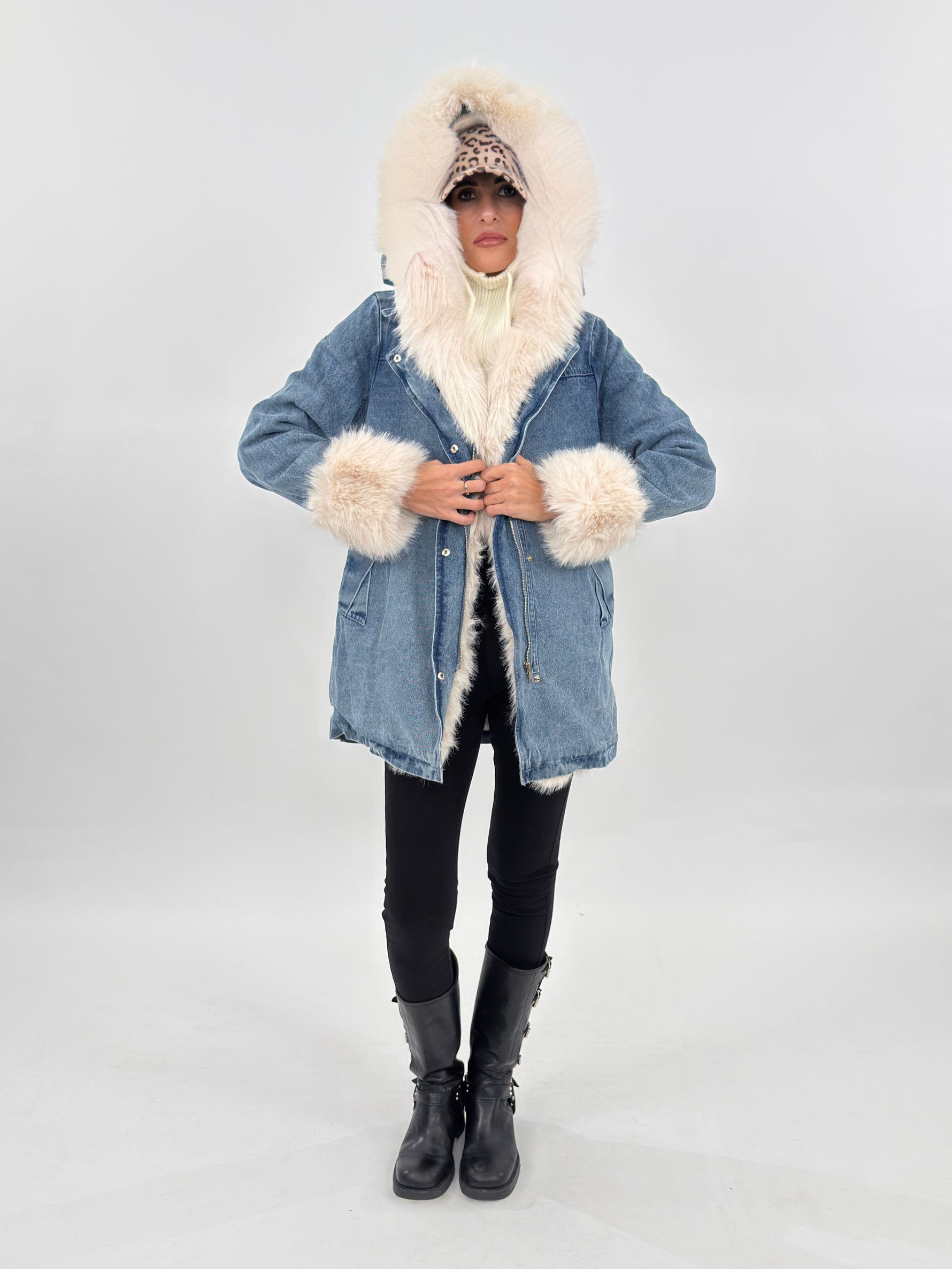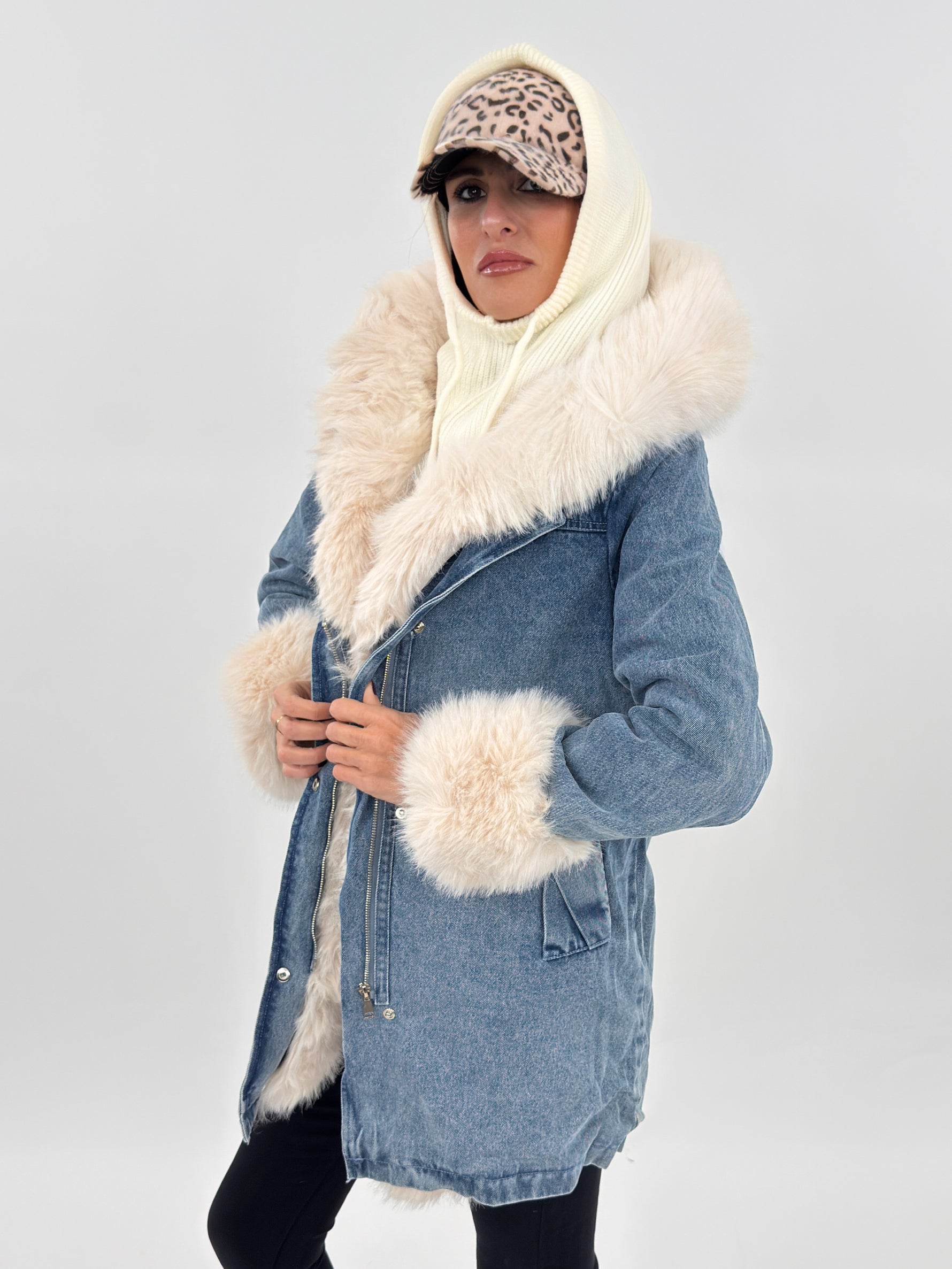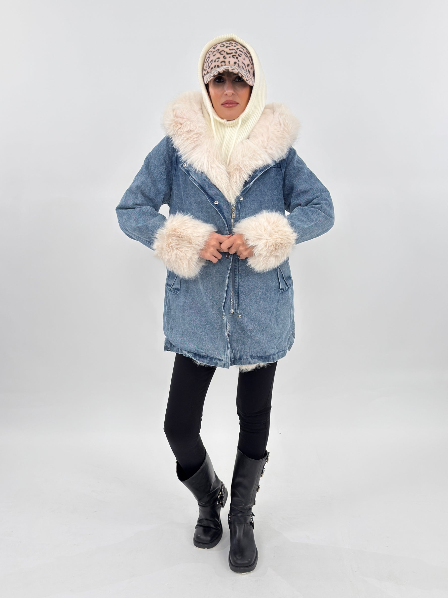 Giubbotto modello Field Jacket lungo in denim jeans, maniche lunghe e tasche frontali. Fodera interna in morbida ecopelliccia sintetica, collo e polsini sempre in ecopelliccia rimovibili. Chiusura frontale con zip.