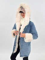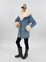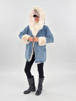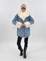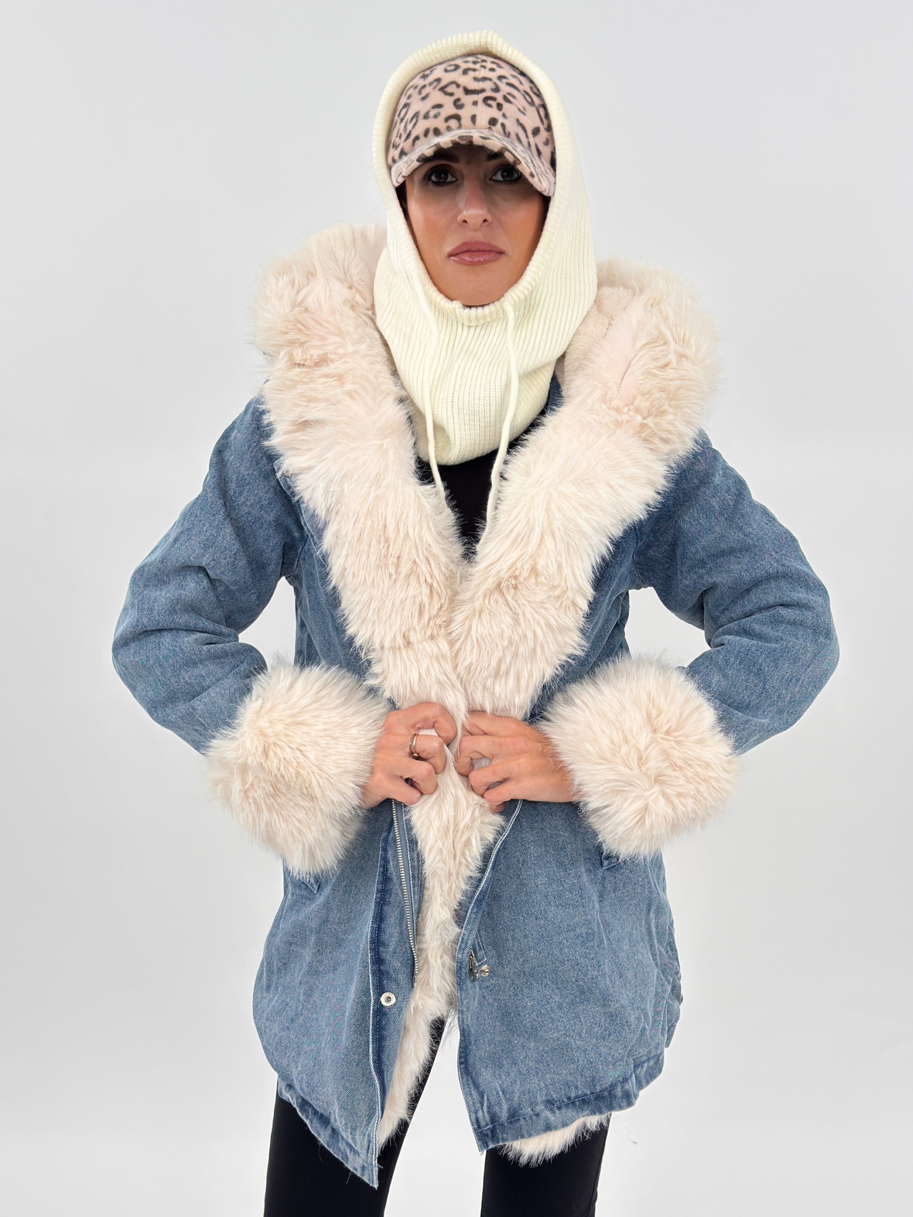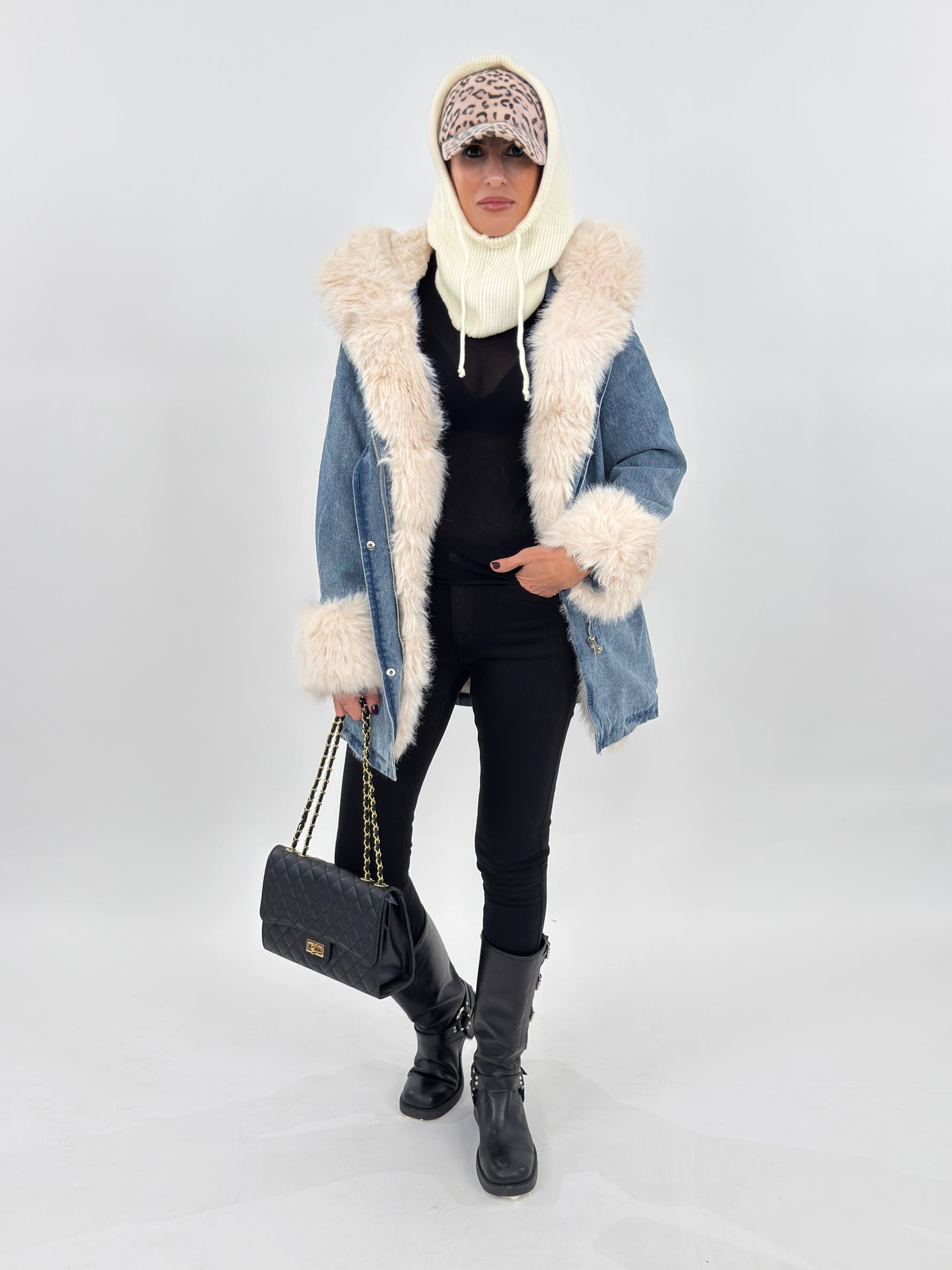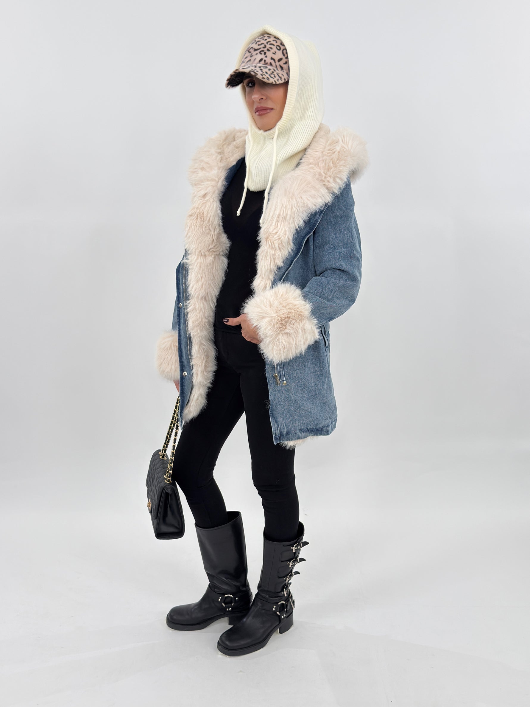 Giubbotto modello Field Jacket lungo in denim jeans, maniche lunghe e tasche frontali. Fodera interna in morbida ecopelliccia sintetica, collo e polsini sempre in ecopelliccia rimovibili. Chiusura frontale con zip.