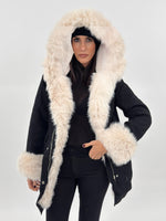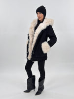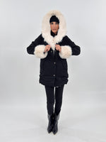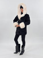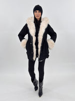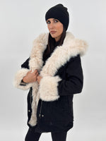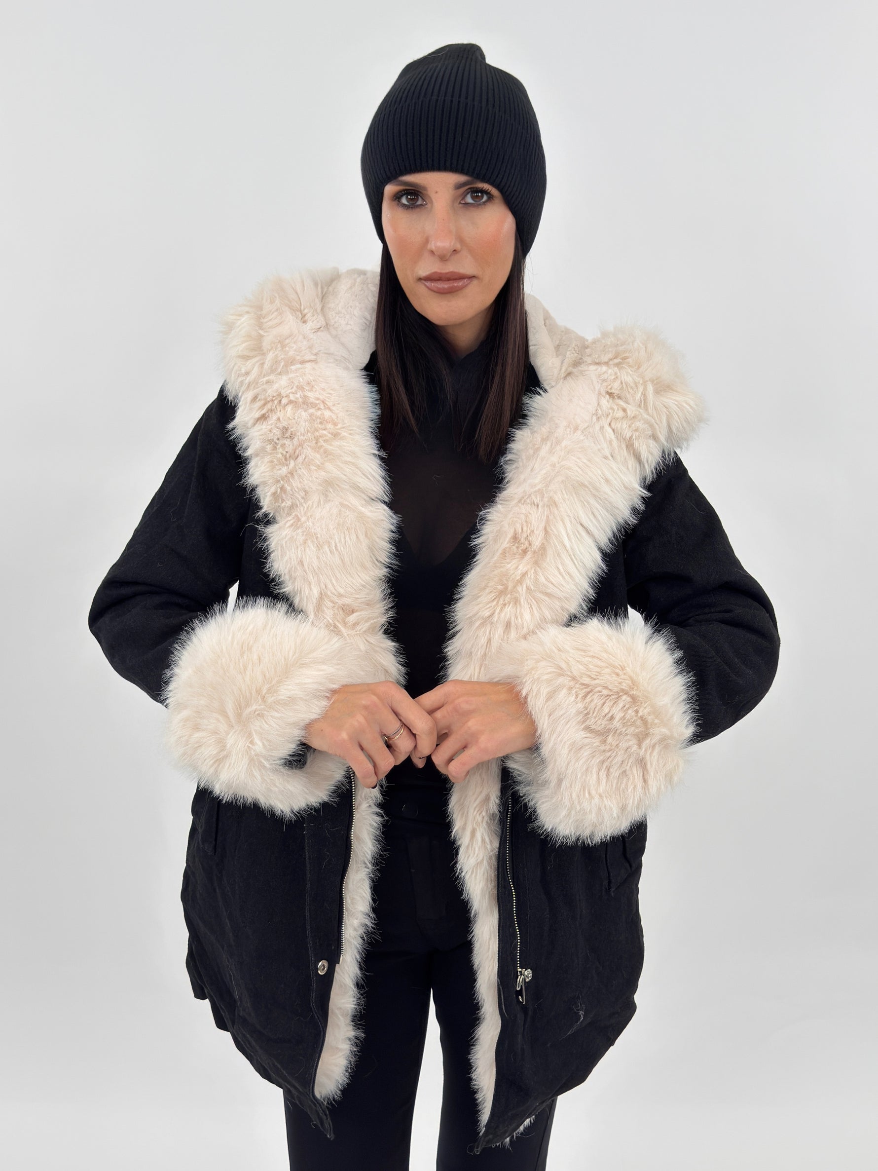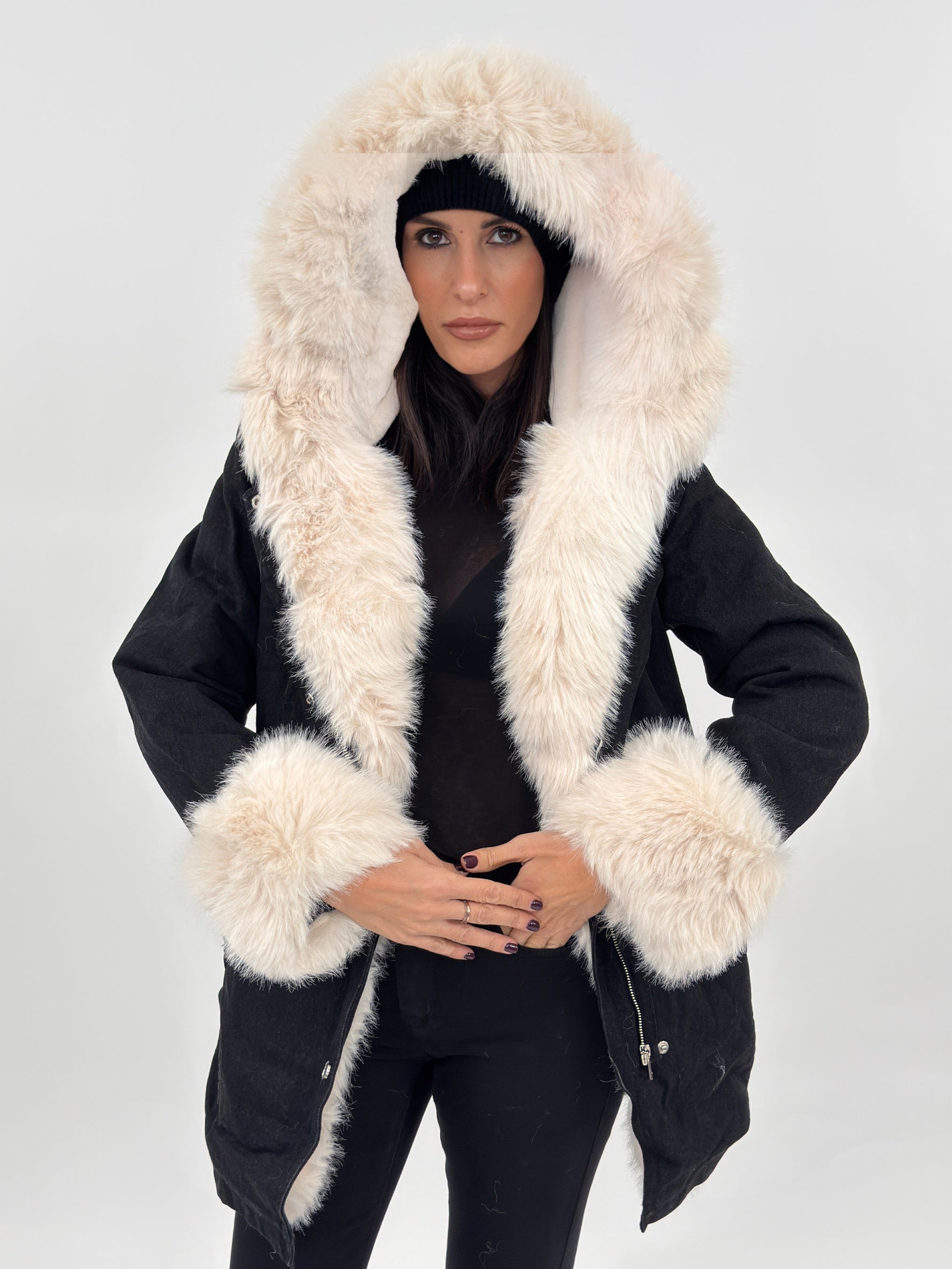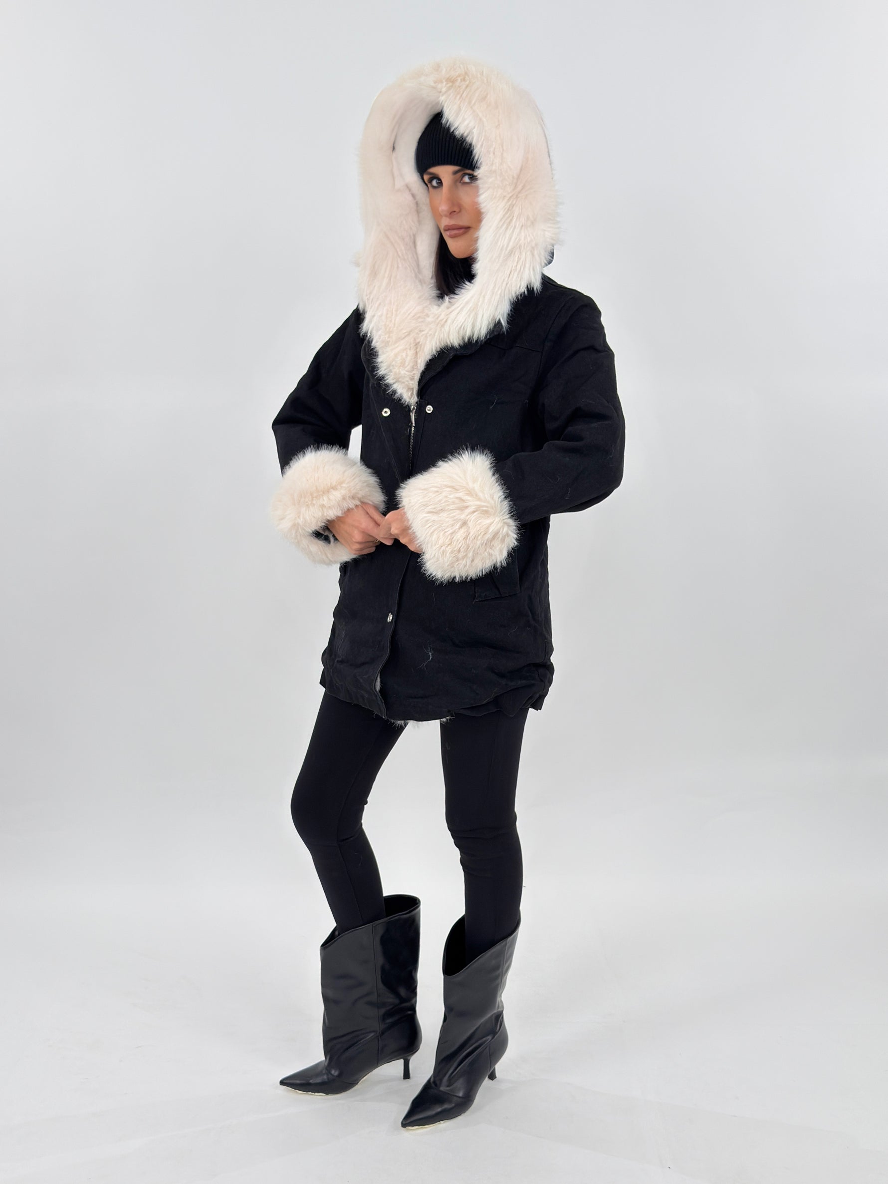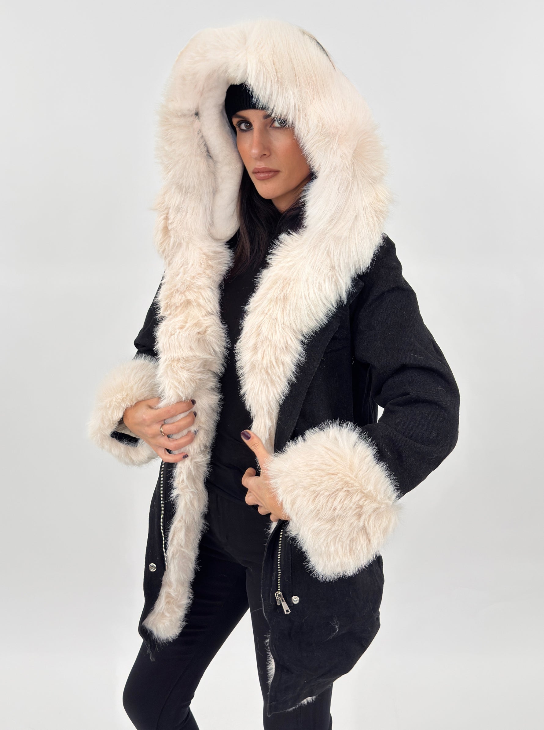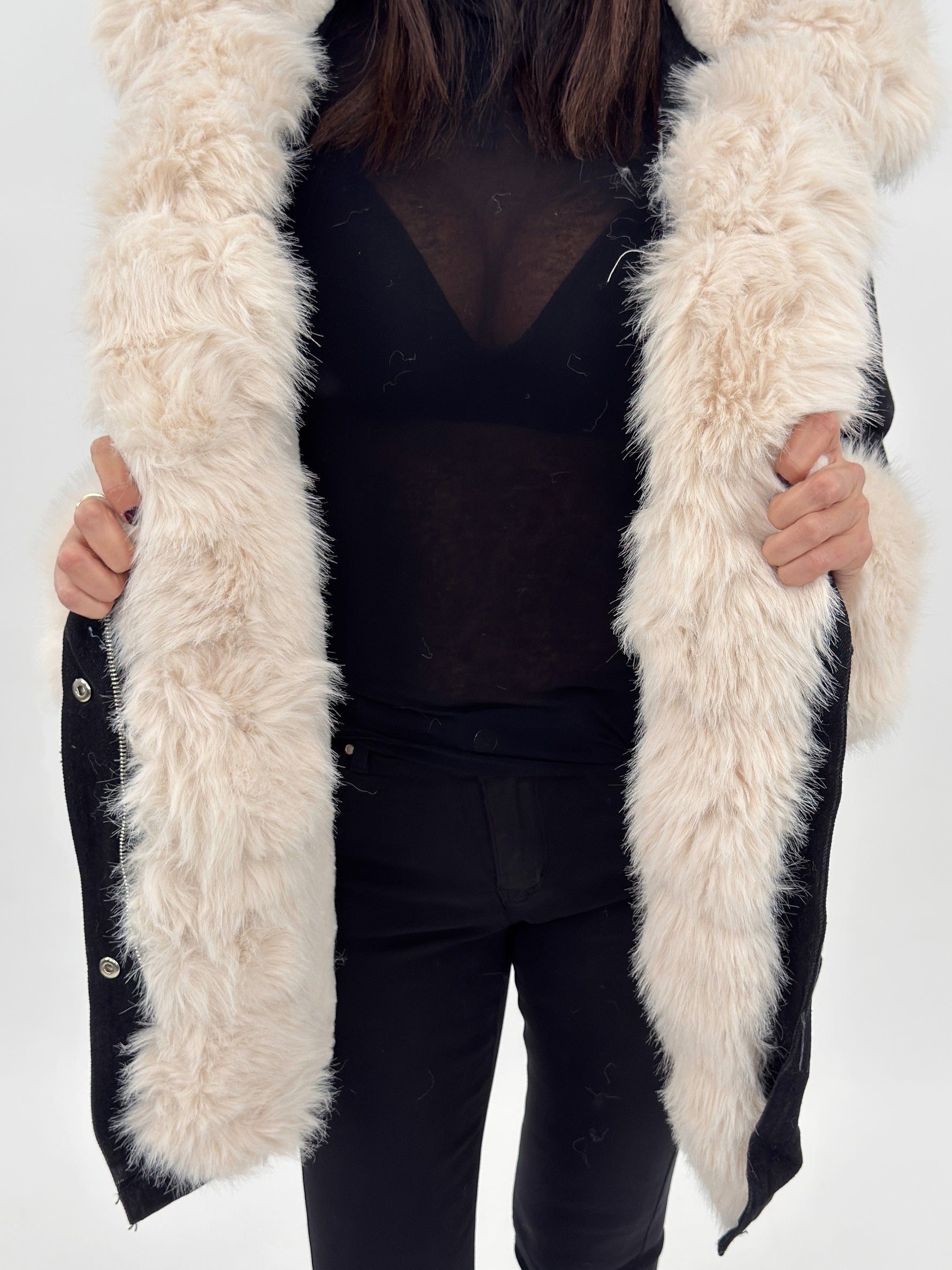 Giubbotto modello Field Jacket lungo in denim jeans, maniche lunghe e tasche frontali. Fodera interna in morbida ecopelliccia sintetica, collo e polsini sempre in ecopelliccia rimovibili. Chiusura frontale con zip.
