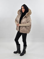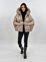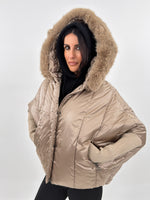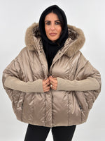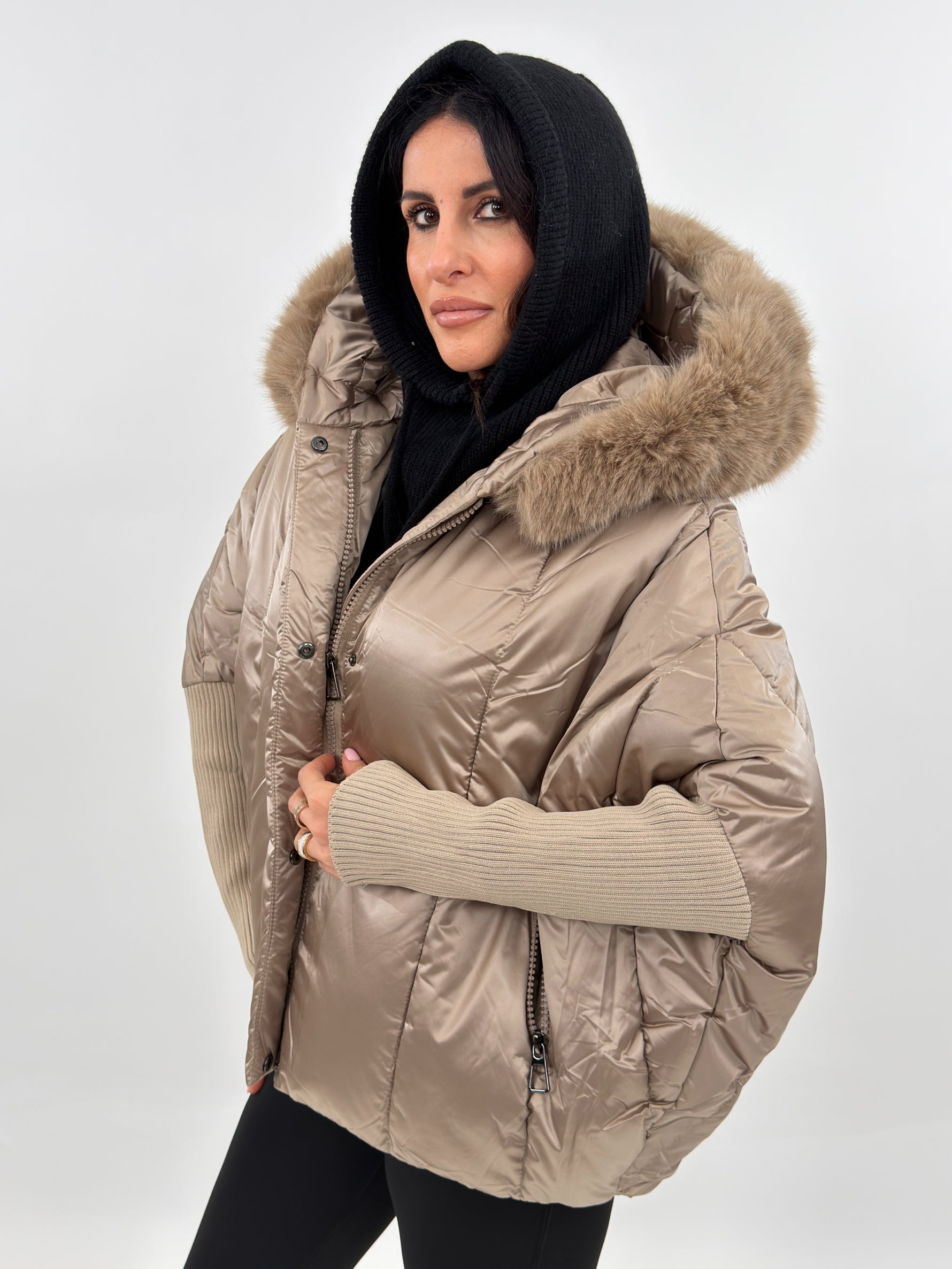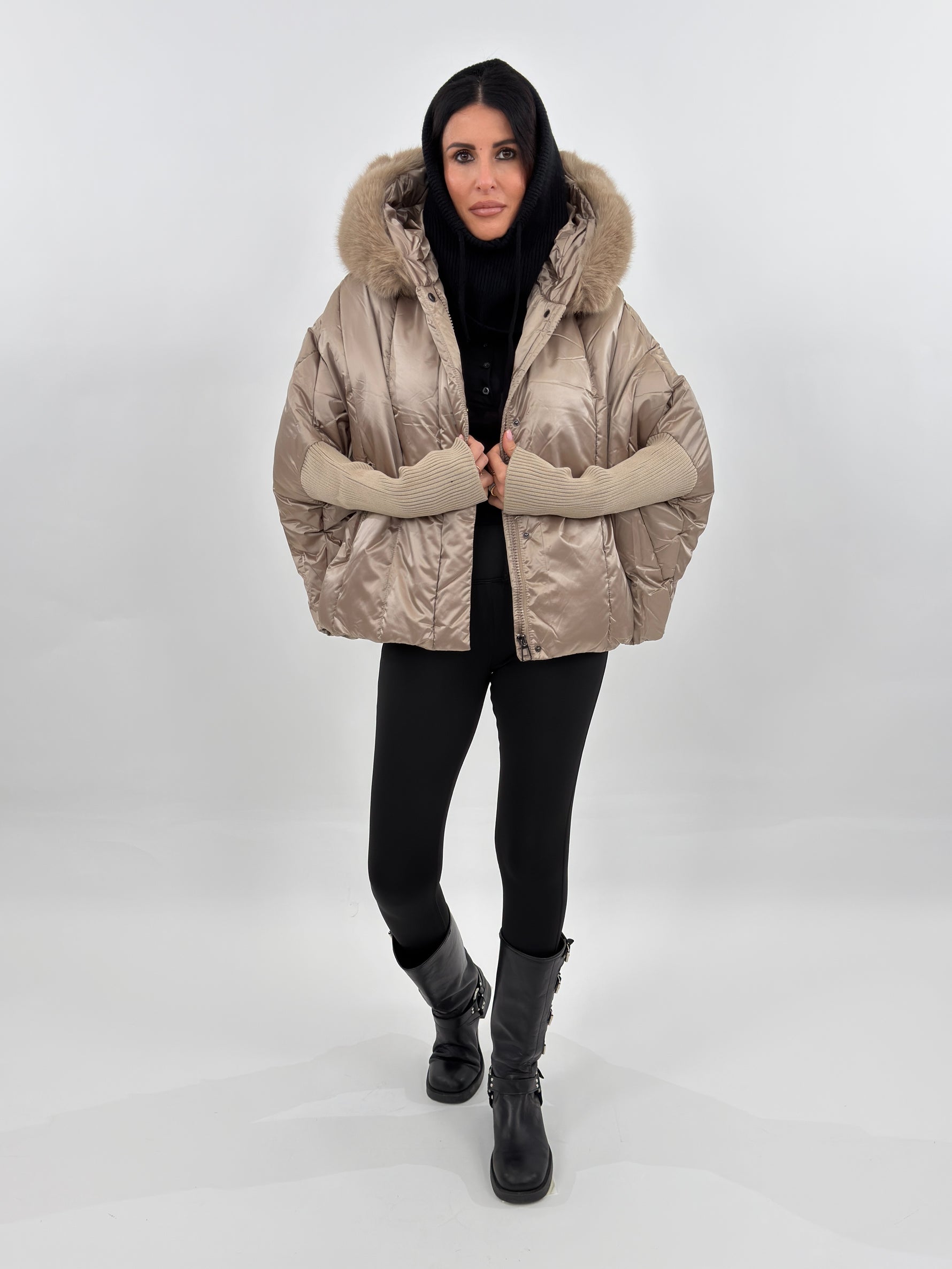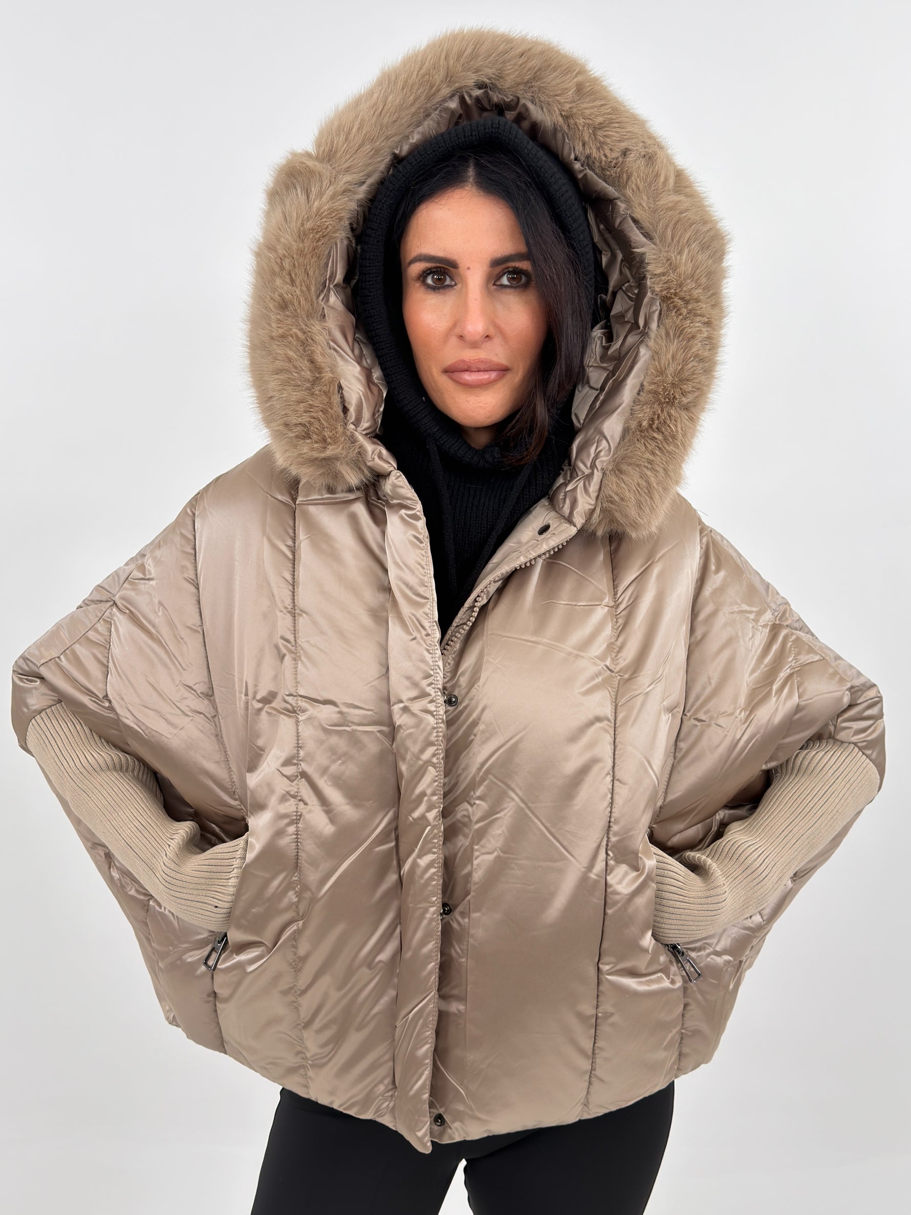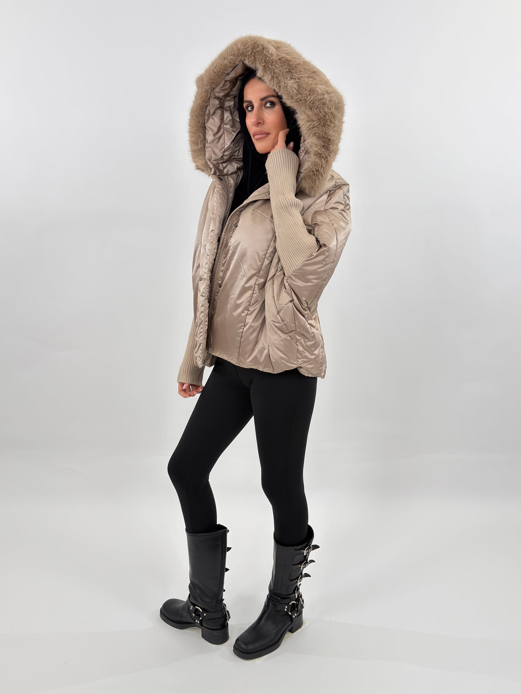 Giubbotto modello piumino effetto trapuntato. Presenta fodera interna, cappuccio bordato in pelliccia rimovibile, maniche lunghe in maglia e tasche frontali con zip.