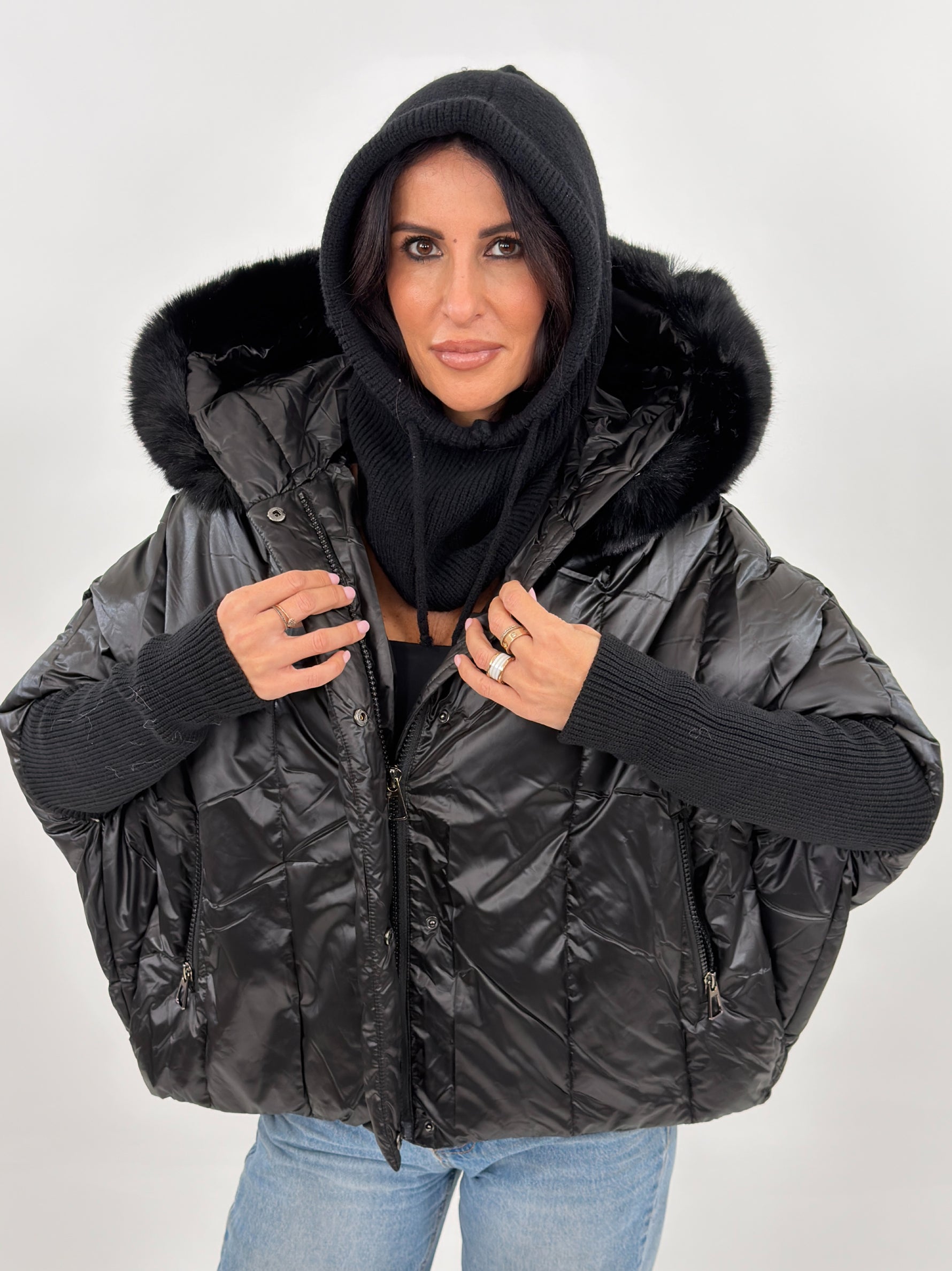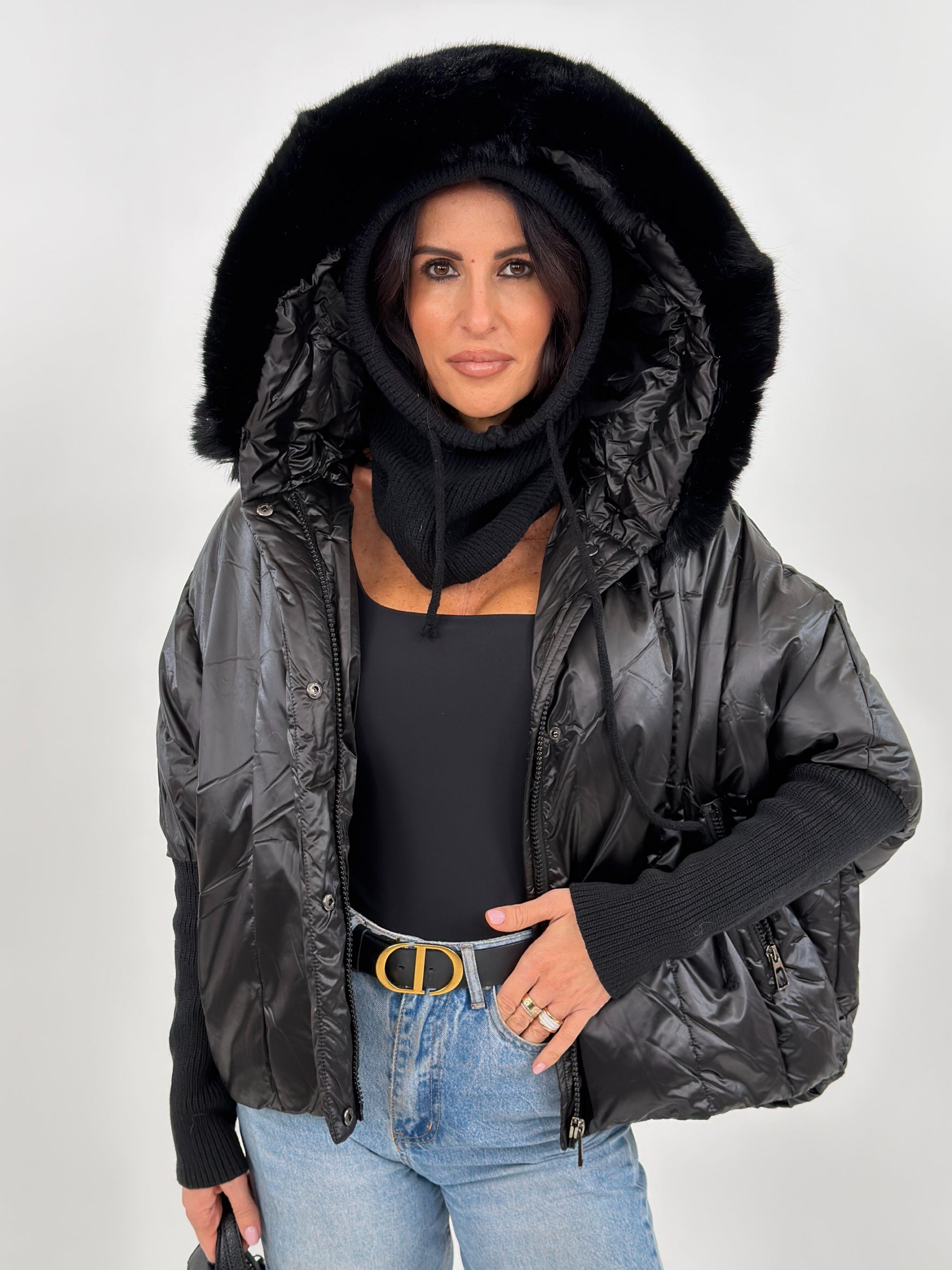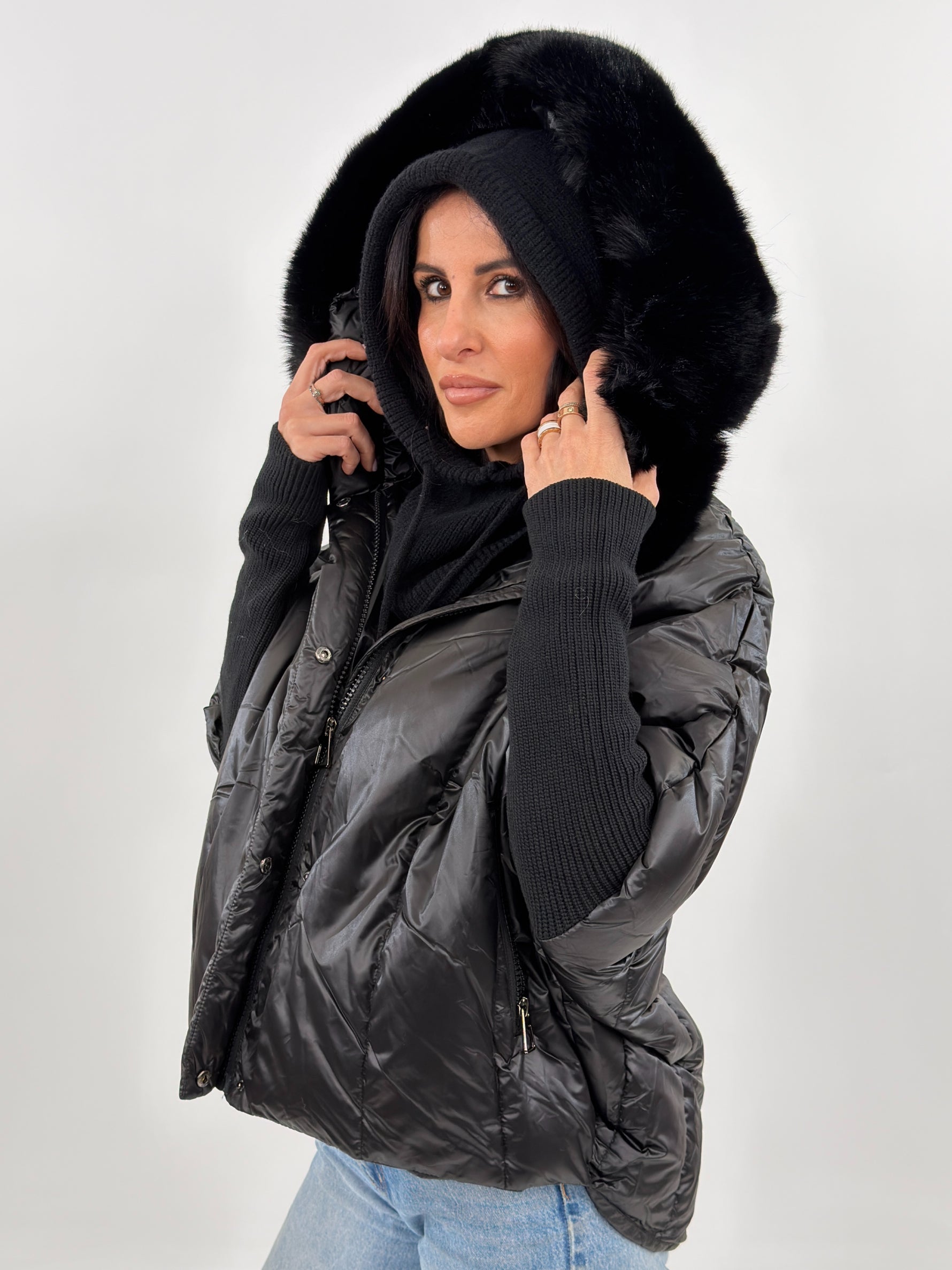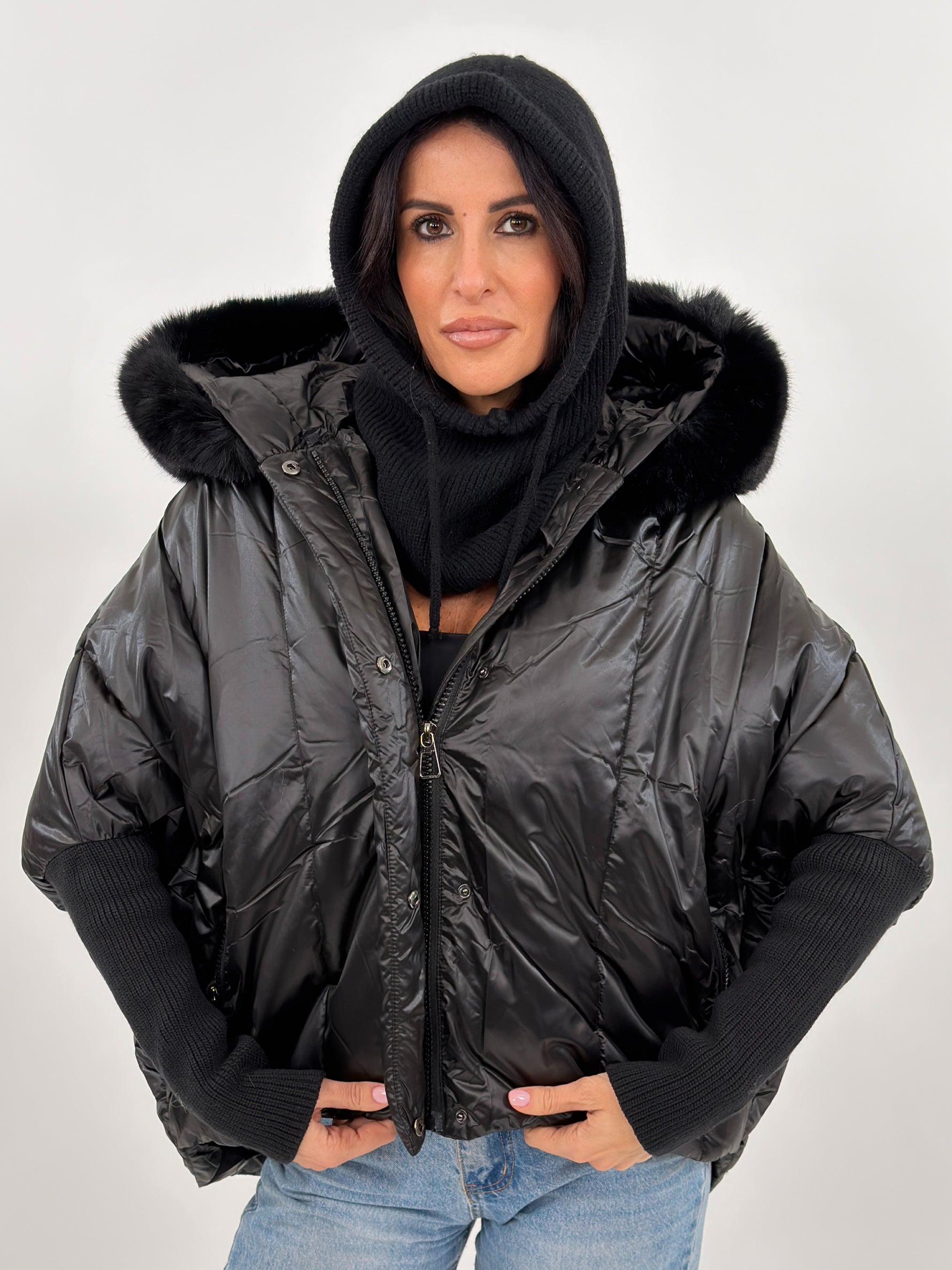 Giubbotto modello piumino effetto trapuntato. Presenta fodera interna, cappuccio bordato in pelliccia rimovibile, maniche lunghe in maglia e tasche frontali con zip.