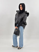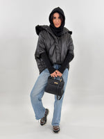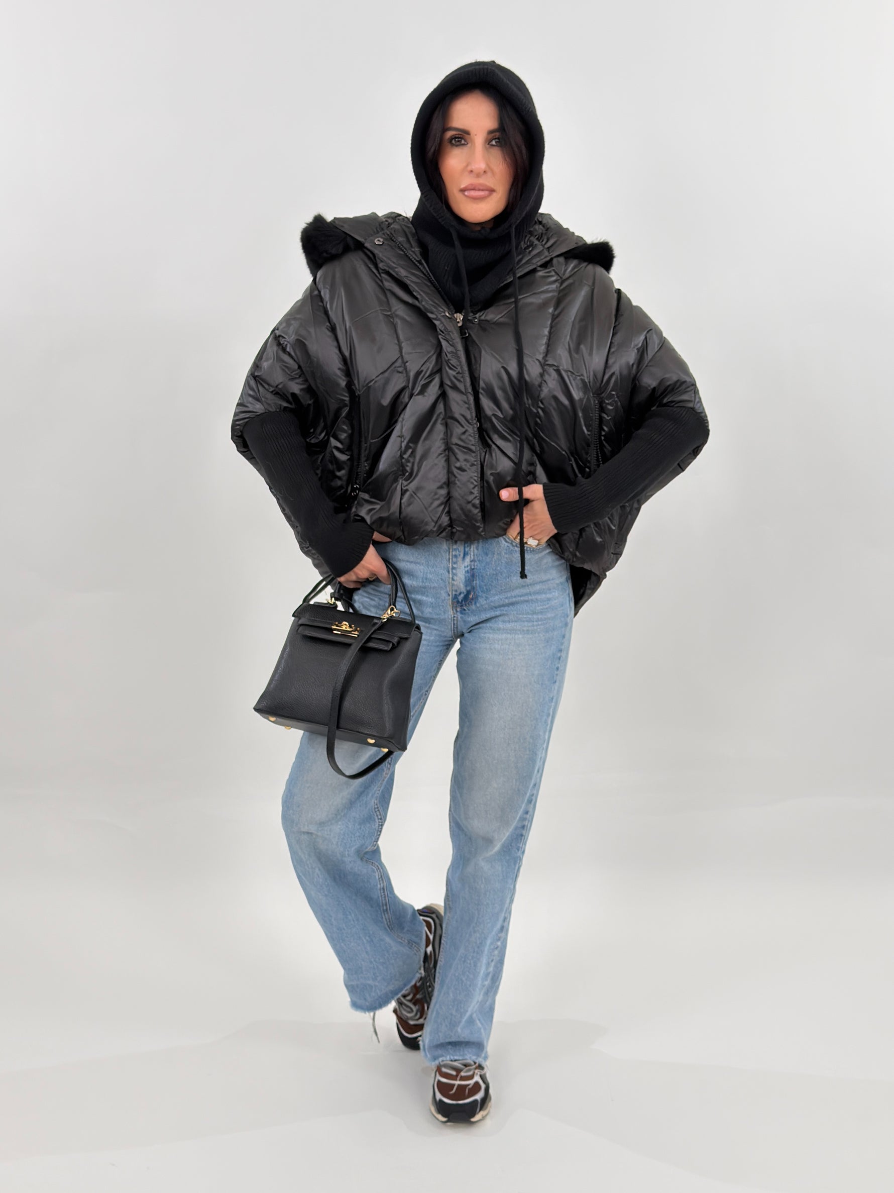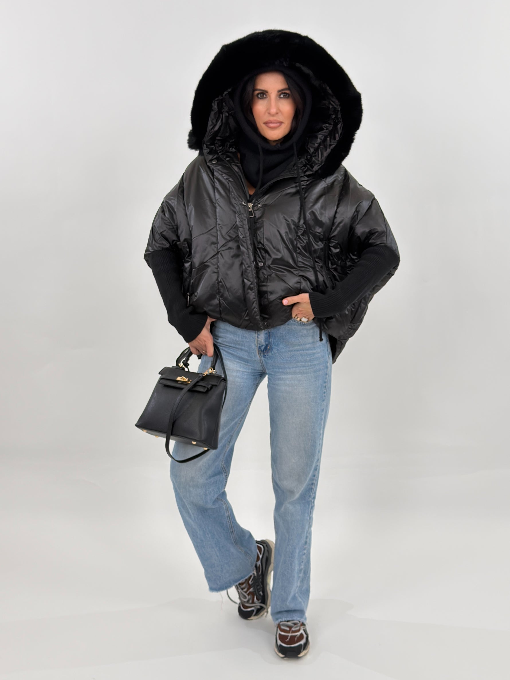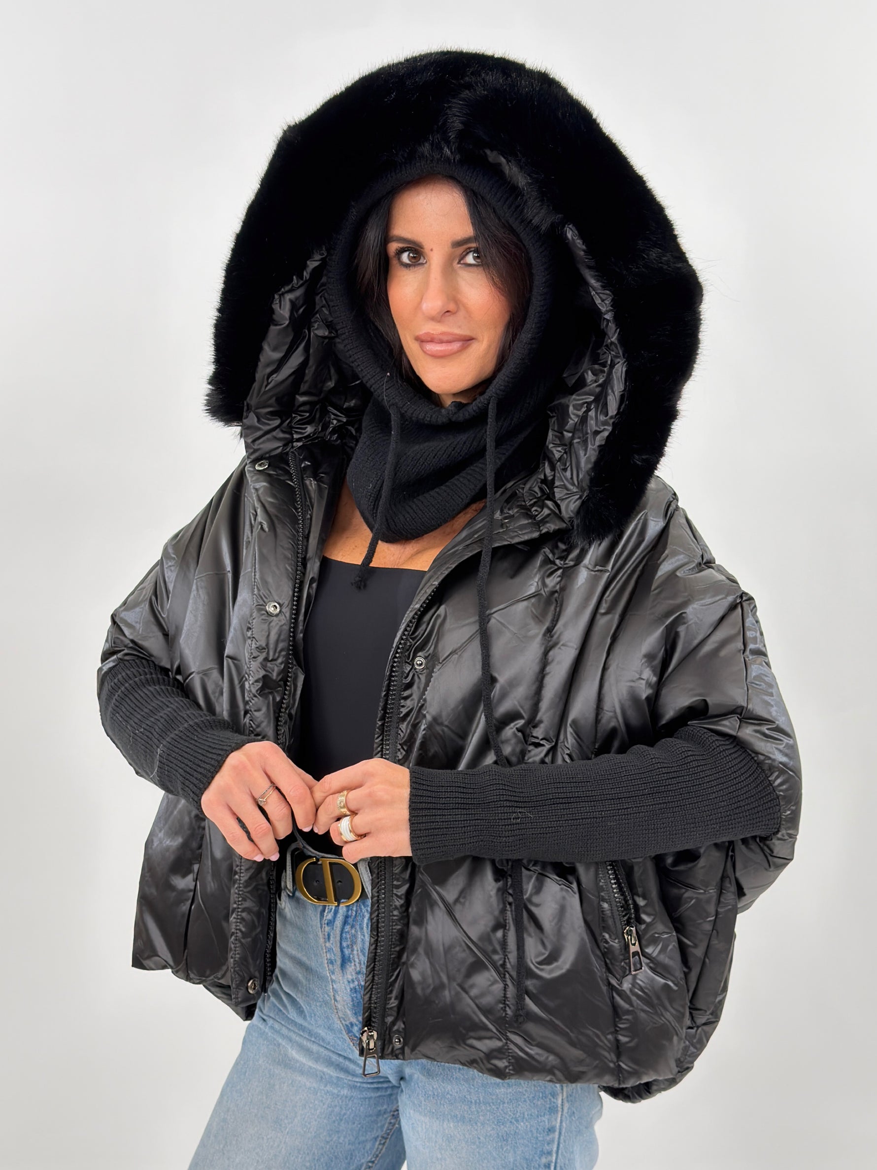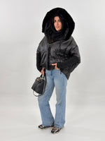 Giubbotto modello piumino effetto trapuntato. Presenta fodera interna, cappuccio bordato in pelliccia rimovibile, maniche lunghe in maglia e tasche frontali con zip.