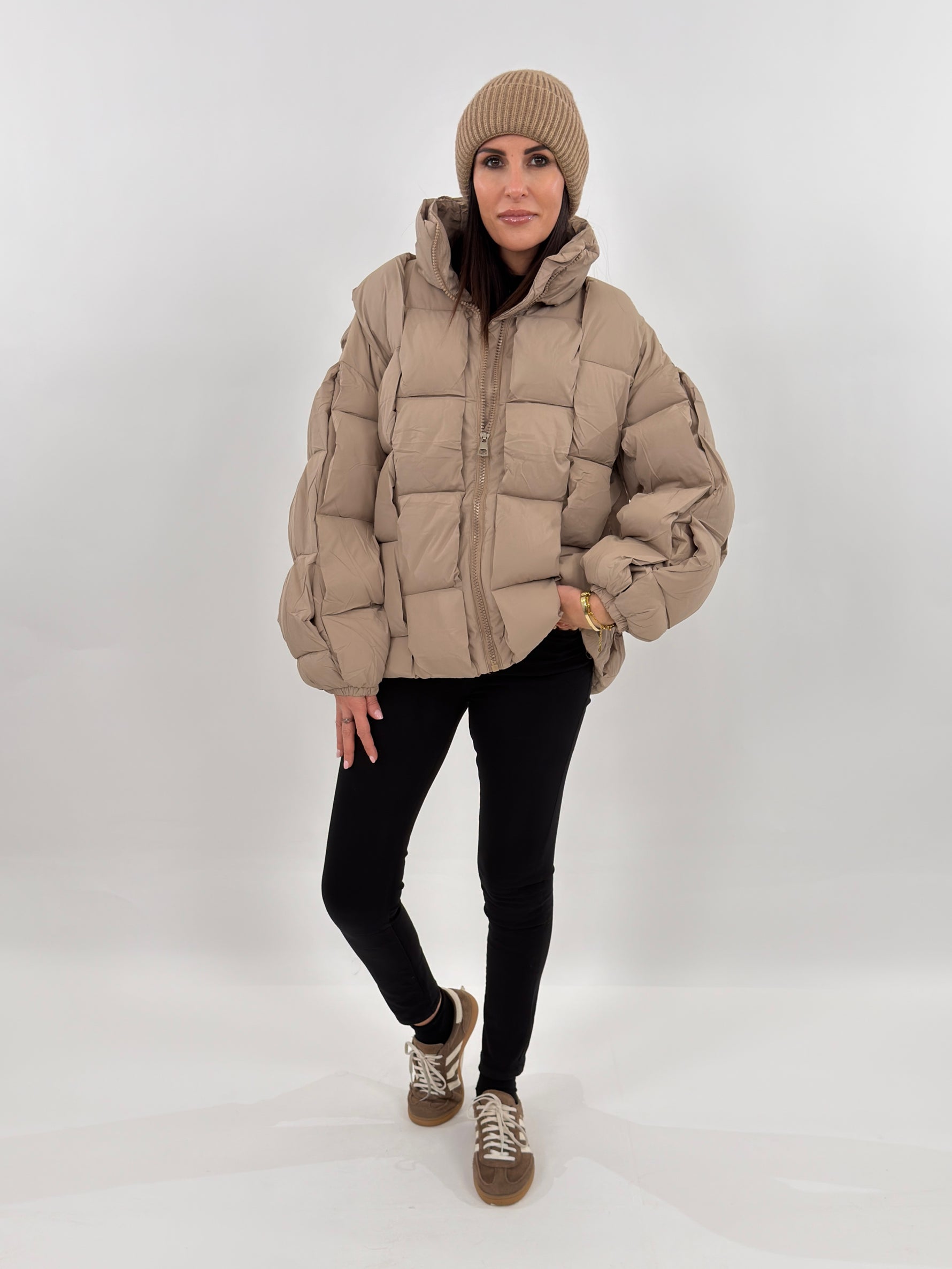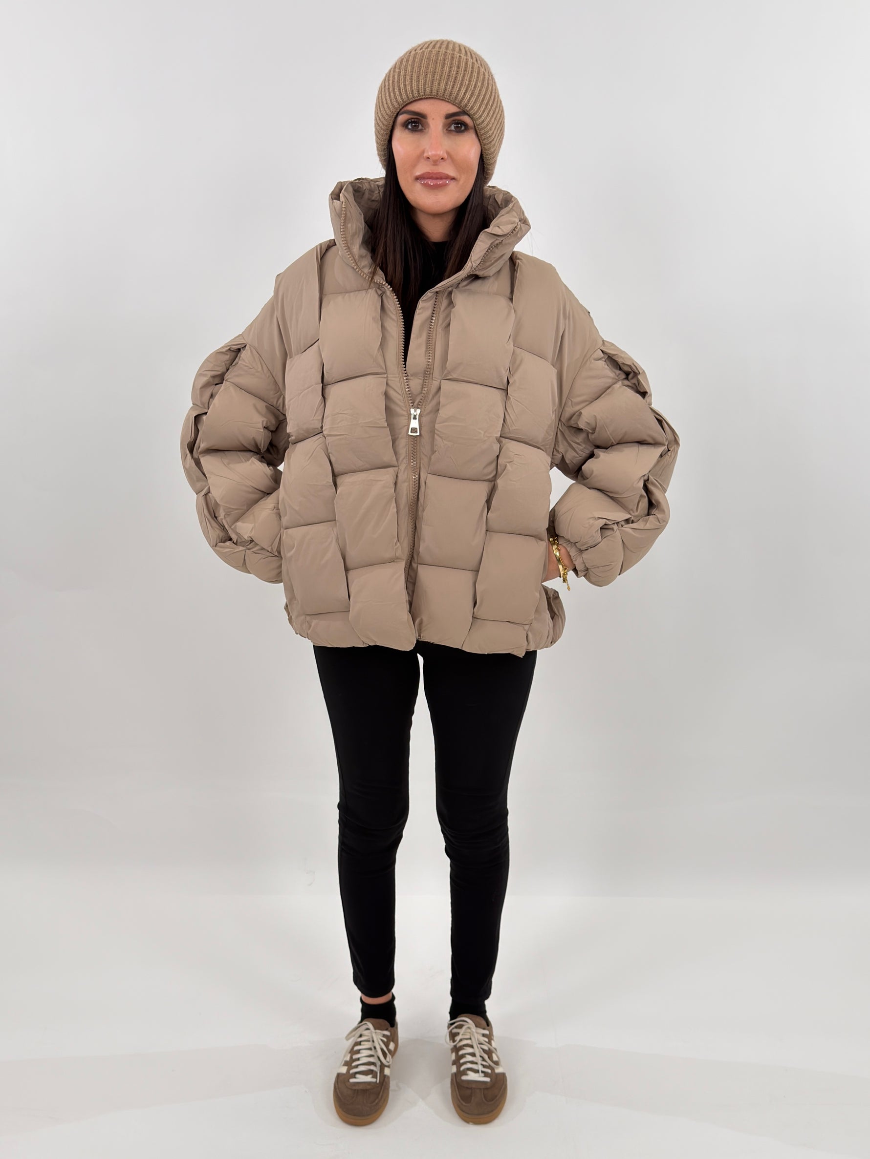 Giubbotto modello piumino oversize effetto trapuntato. Presenta fodera interna, collo alto, maniche lunghe con polsino elastico e tasche laterali con zip a scomparsa. Chiusura frontale con zip tono su tono.