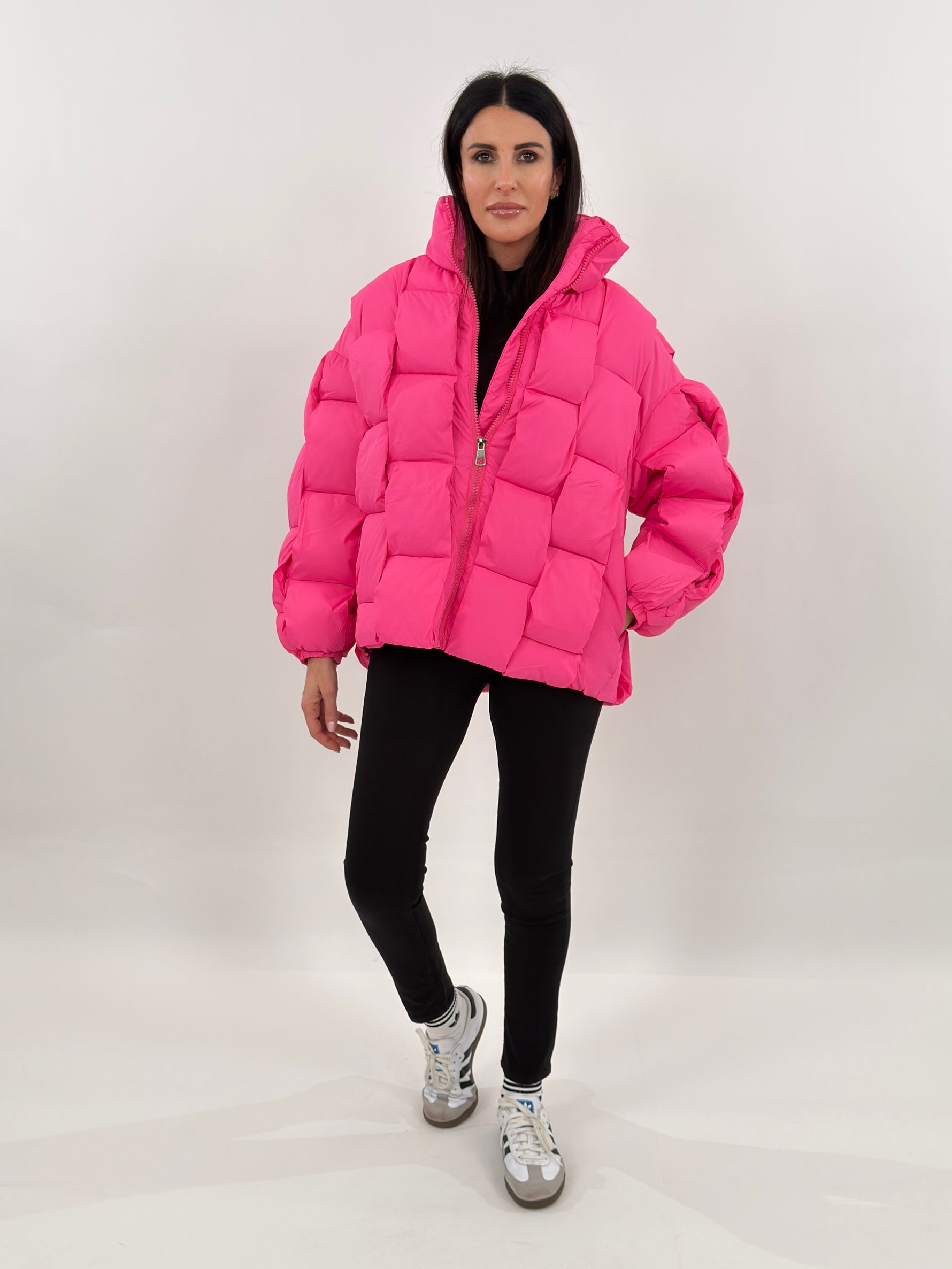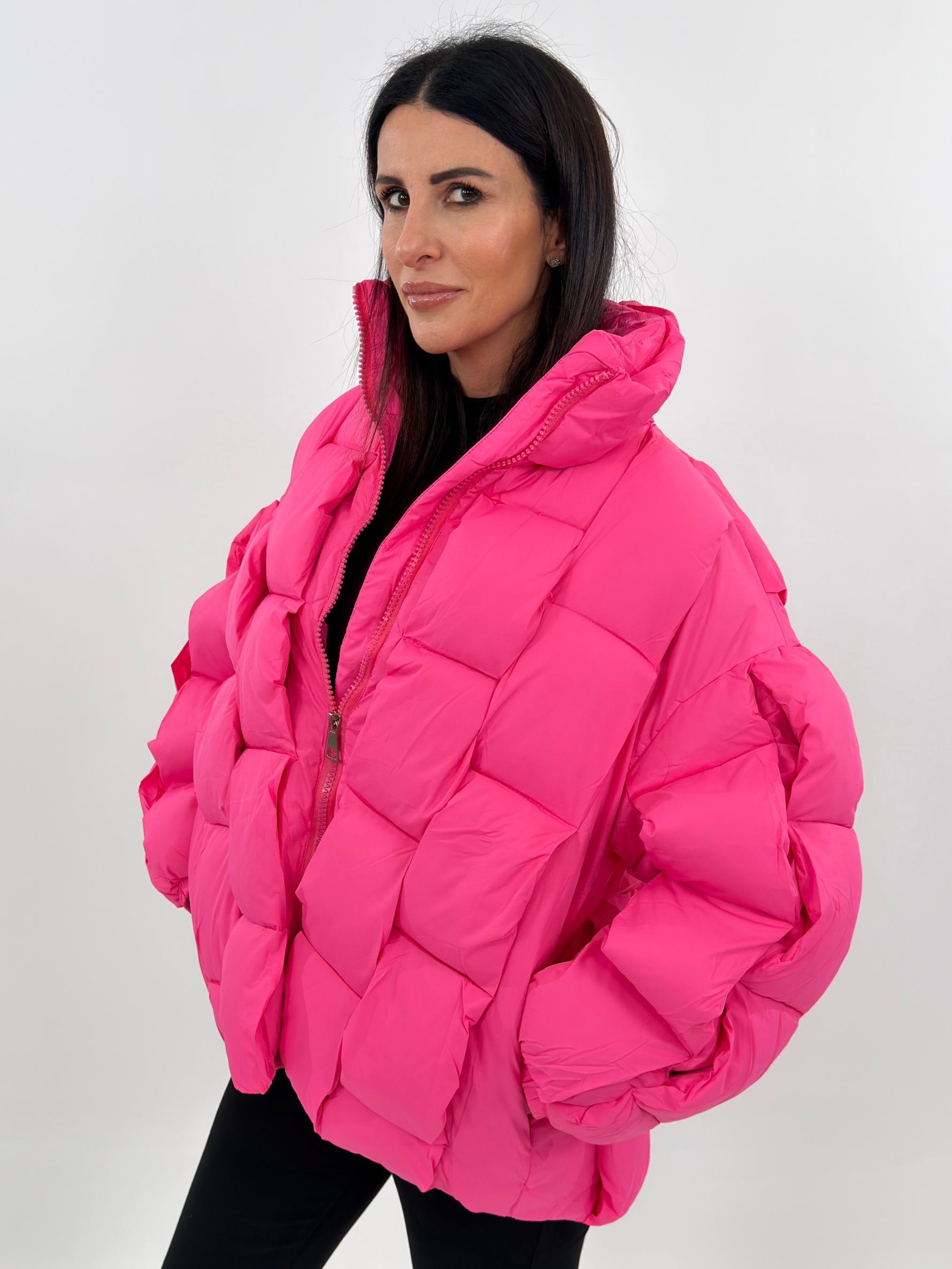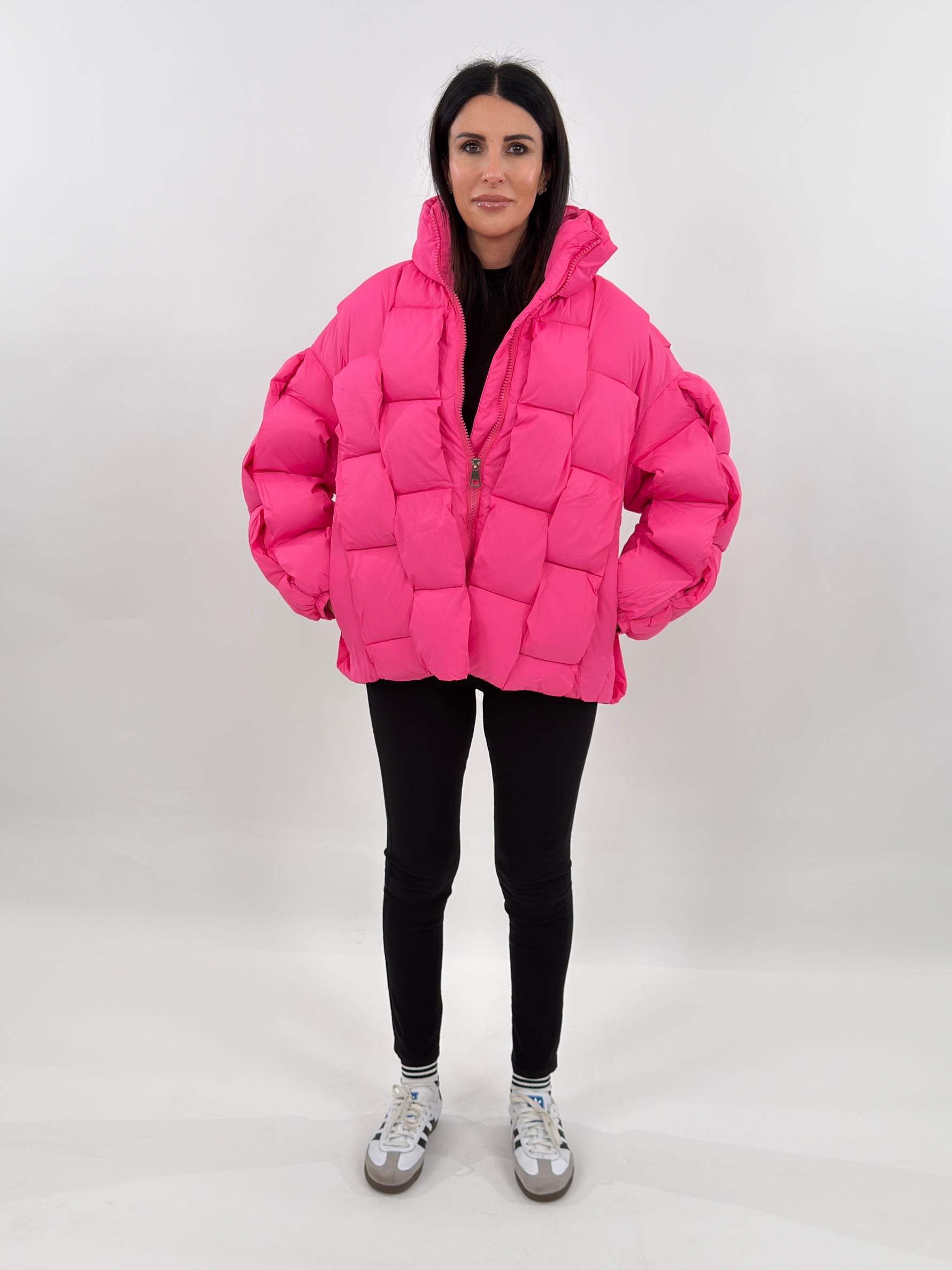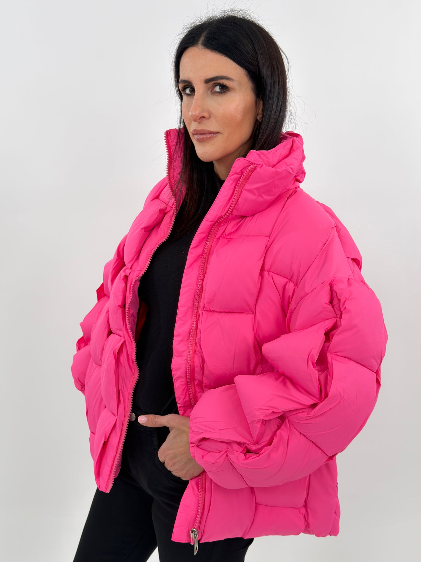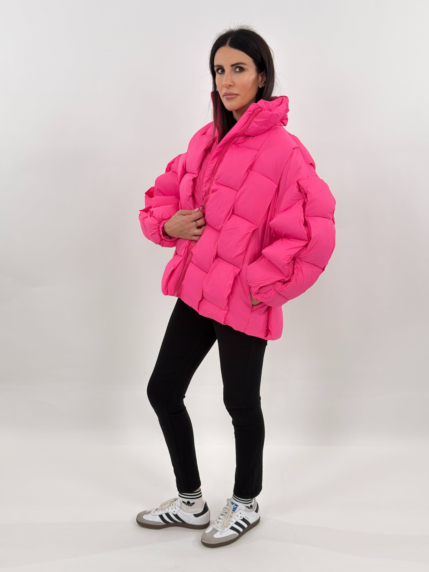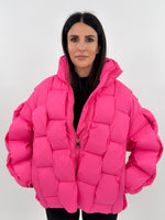 Giubbotto modello piumino oversize effetto trapuntato. Presenta fodera interna, collo alto, maniche lunghe con polsino elastico e tasche laterali con zip a scomparsa. Chiusura frontale con zip tono su tono.