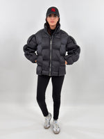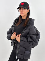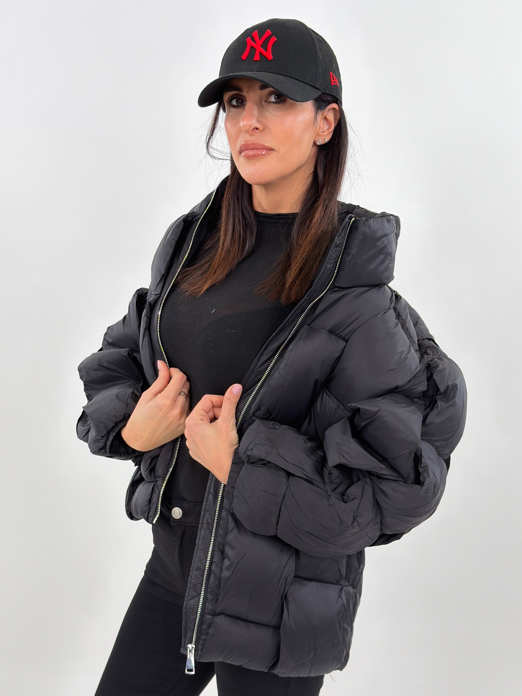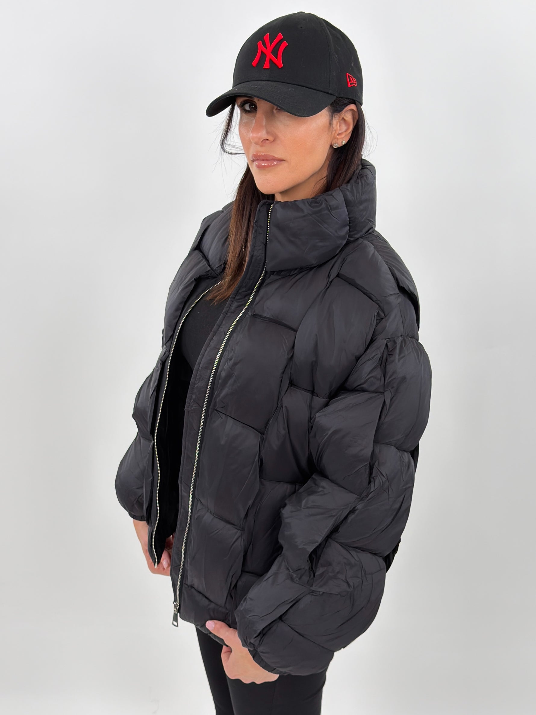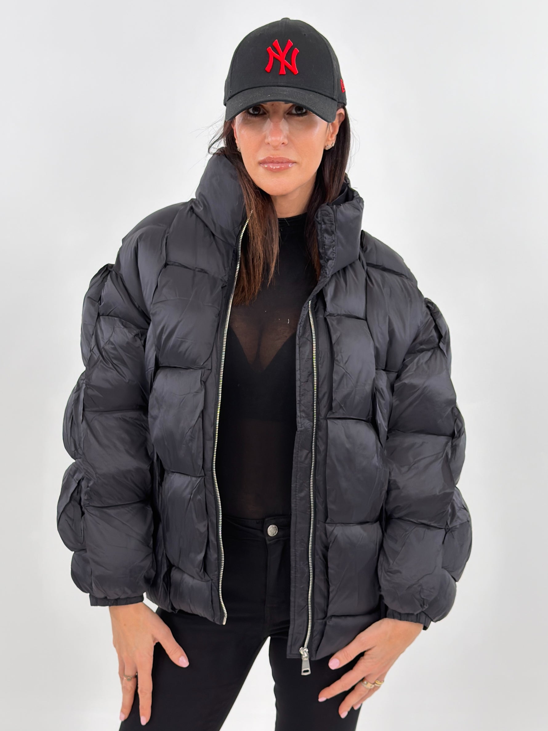 Giubbotto modello piumino oversize effetto trapuntato. Presenta fodera interna, collo alto, maniche lunghe con polsino elastico e tasche laterali con zip a scomparsa. Chiusura frontale con zip tono su tono.