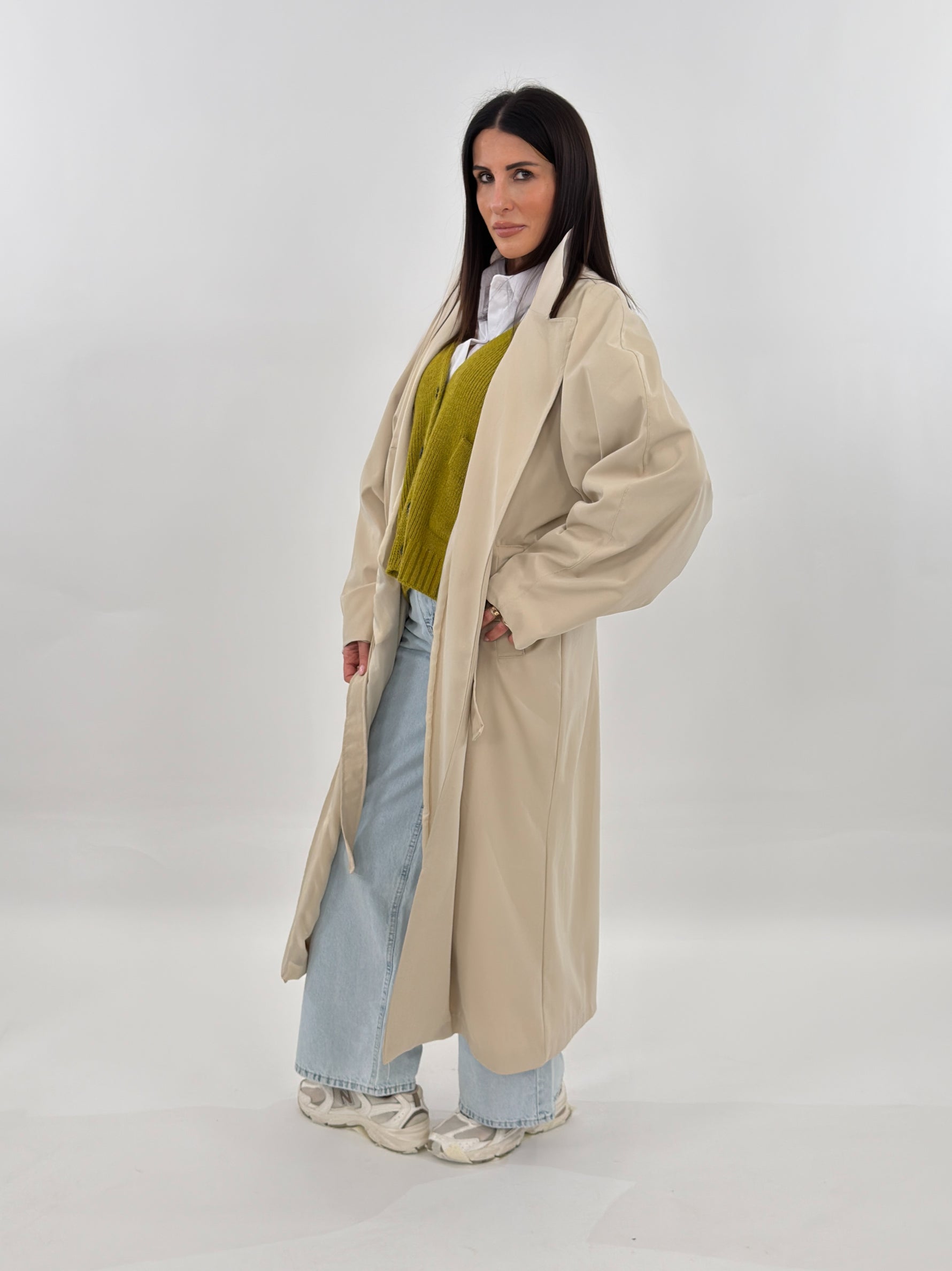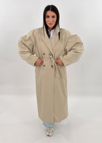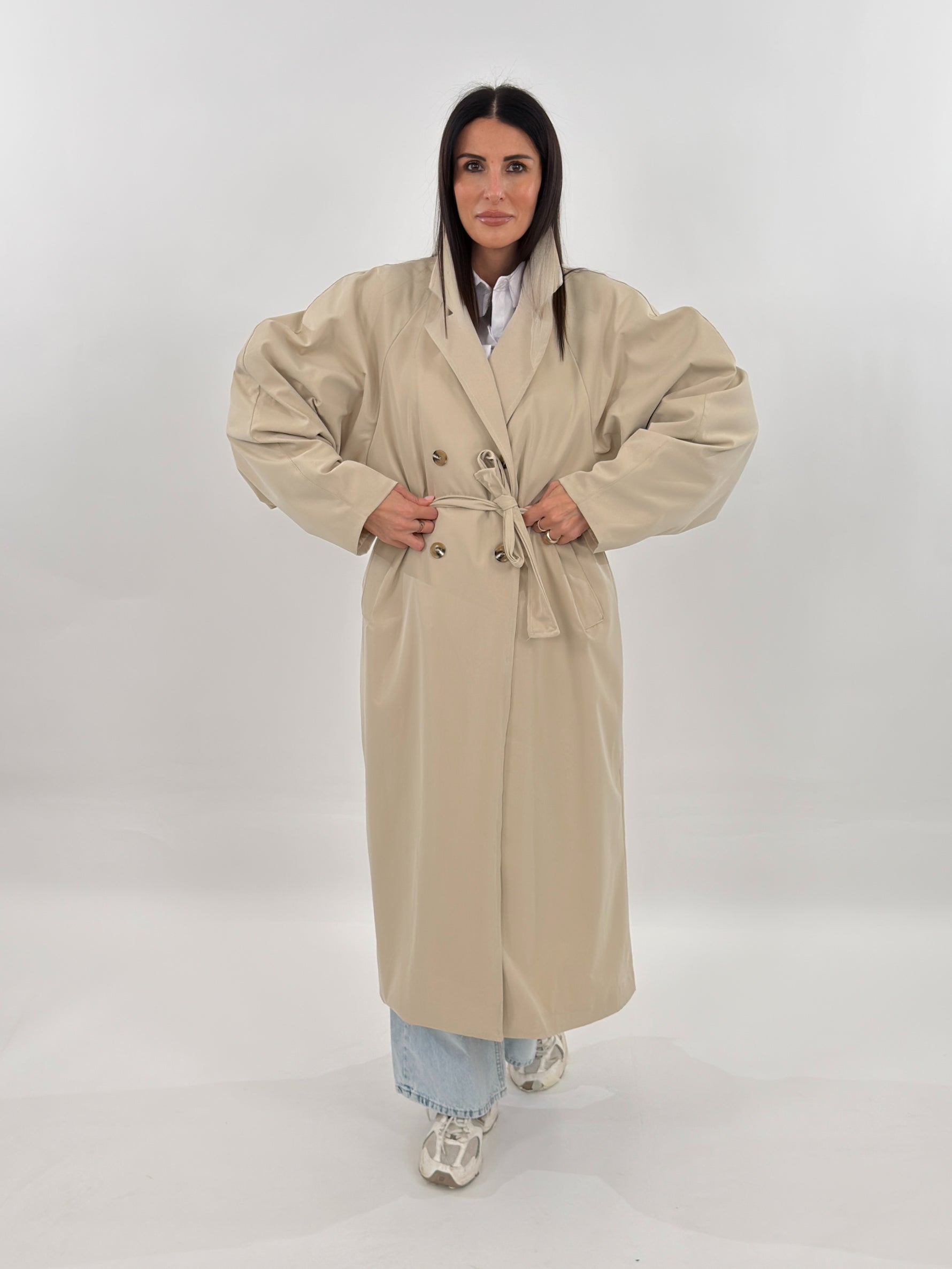 Trench modello lungo a doppio petto con maniche lunghe voluminose e tasche laterali. Chiusura frontale con bottoni e cintura da annodare. Fodera interna.
