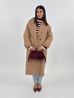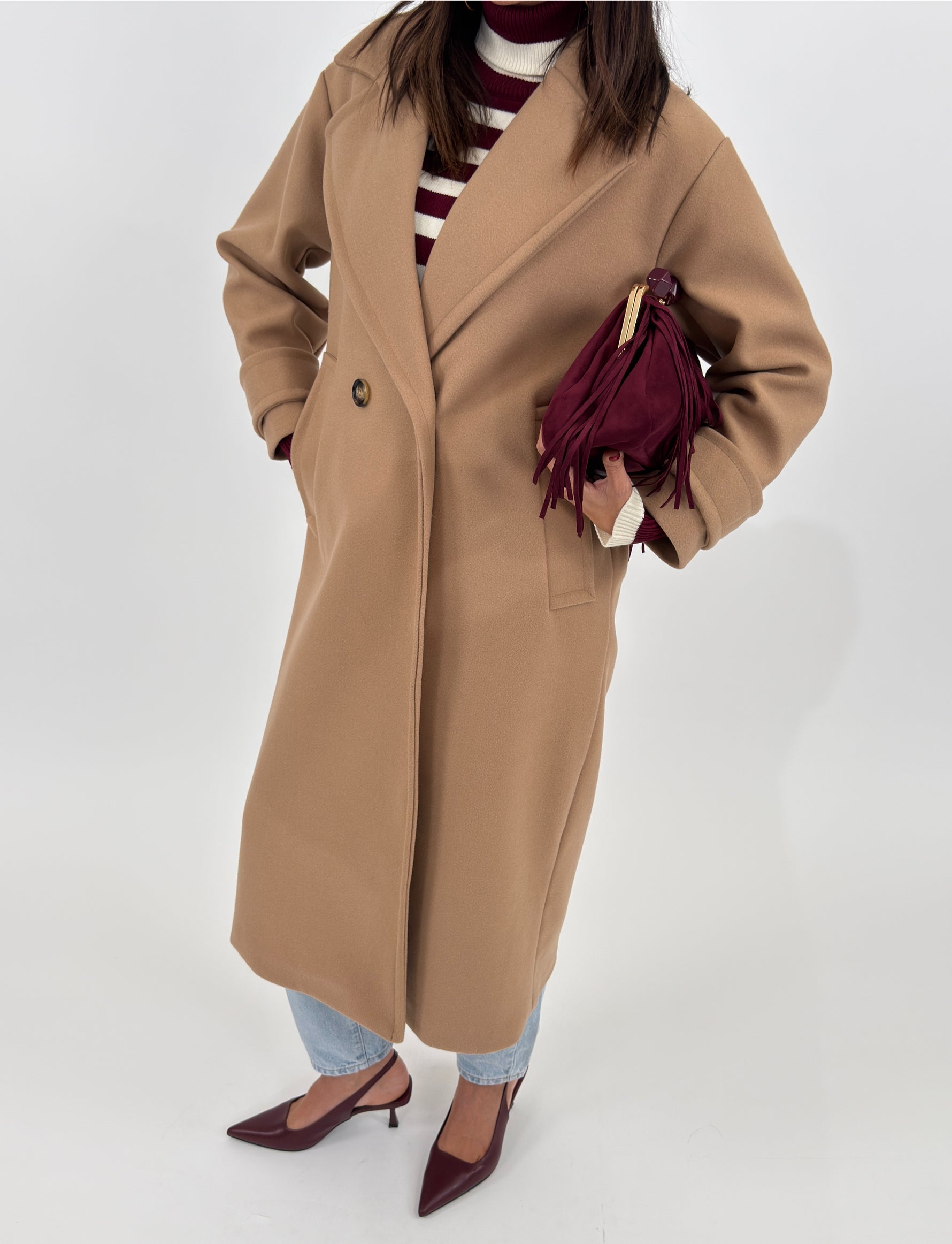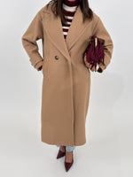 Cappotto modello lungo doppio petto, tasche laterali, maniche lunghe con passanti sul polsino. Chiusura frontale con bottone. Fodera interna.