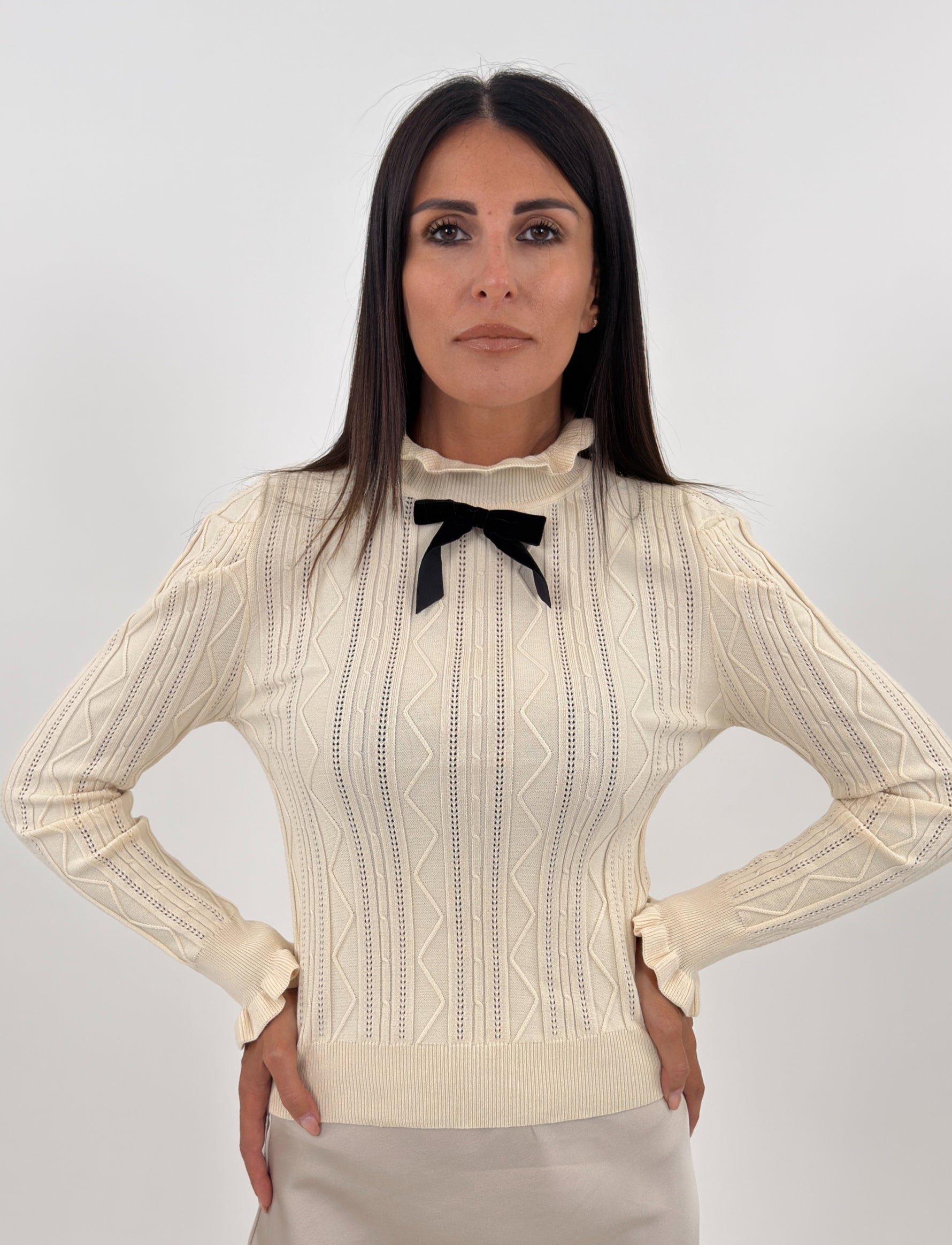 Maglia modello lungo in tessuto a maglia lavorata. Mezzo collo con bordo arricciato e maniche lunghe con volant ai polsini. Spalle leggermente arricciate. Spilla rimovibile sul davanti a forma di fiocco in velluto nero.