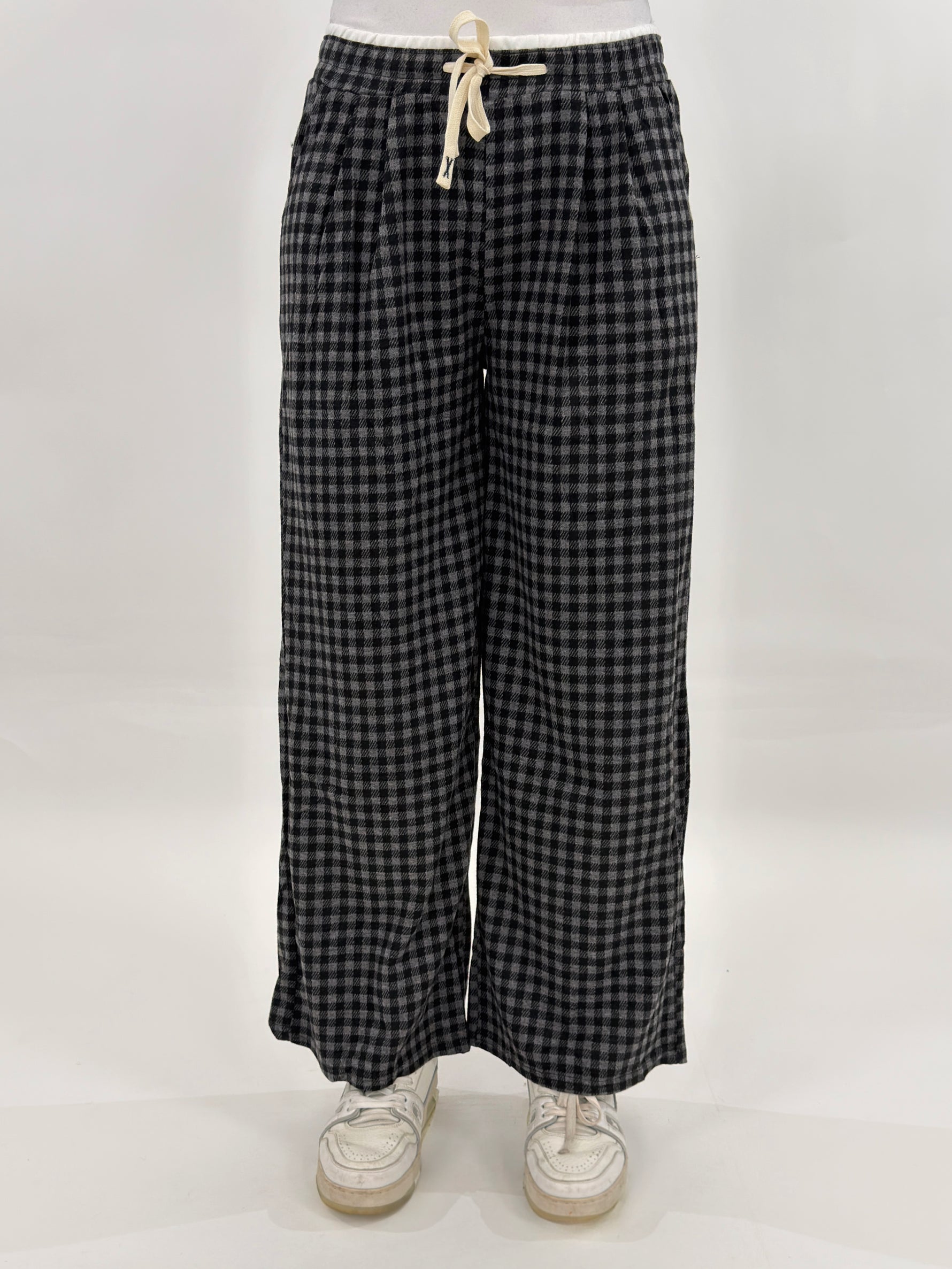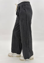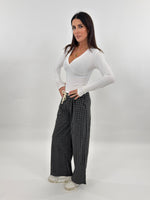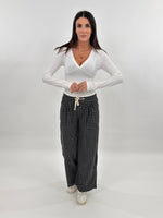 Pantalone modello tuta a gamba larga con bustino elastico e laccetti regolabili.